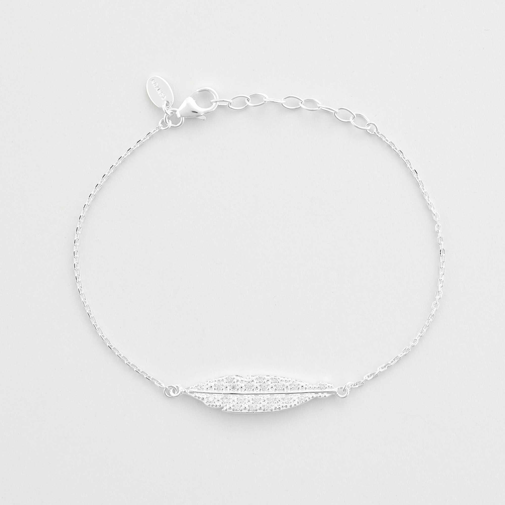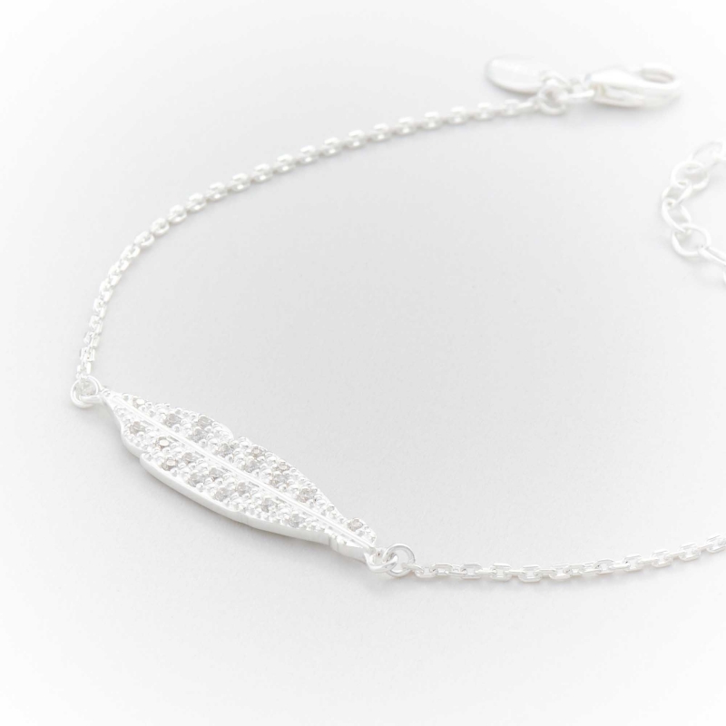 Bracelet en argent 925 composé d'une fine chainette décorée d'une plume moyenne ornée d'oxydes.
