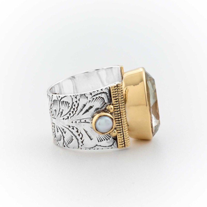 Bague argent grand modele constituée d'une amethyste verte et de 2 perles serties par des anneaux de laiton sur un large anneau ciselé.