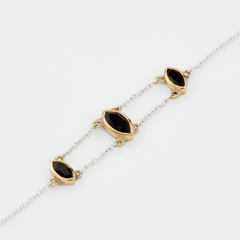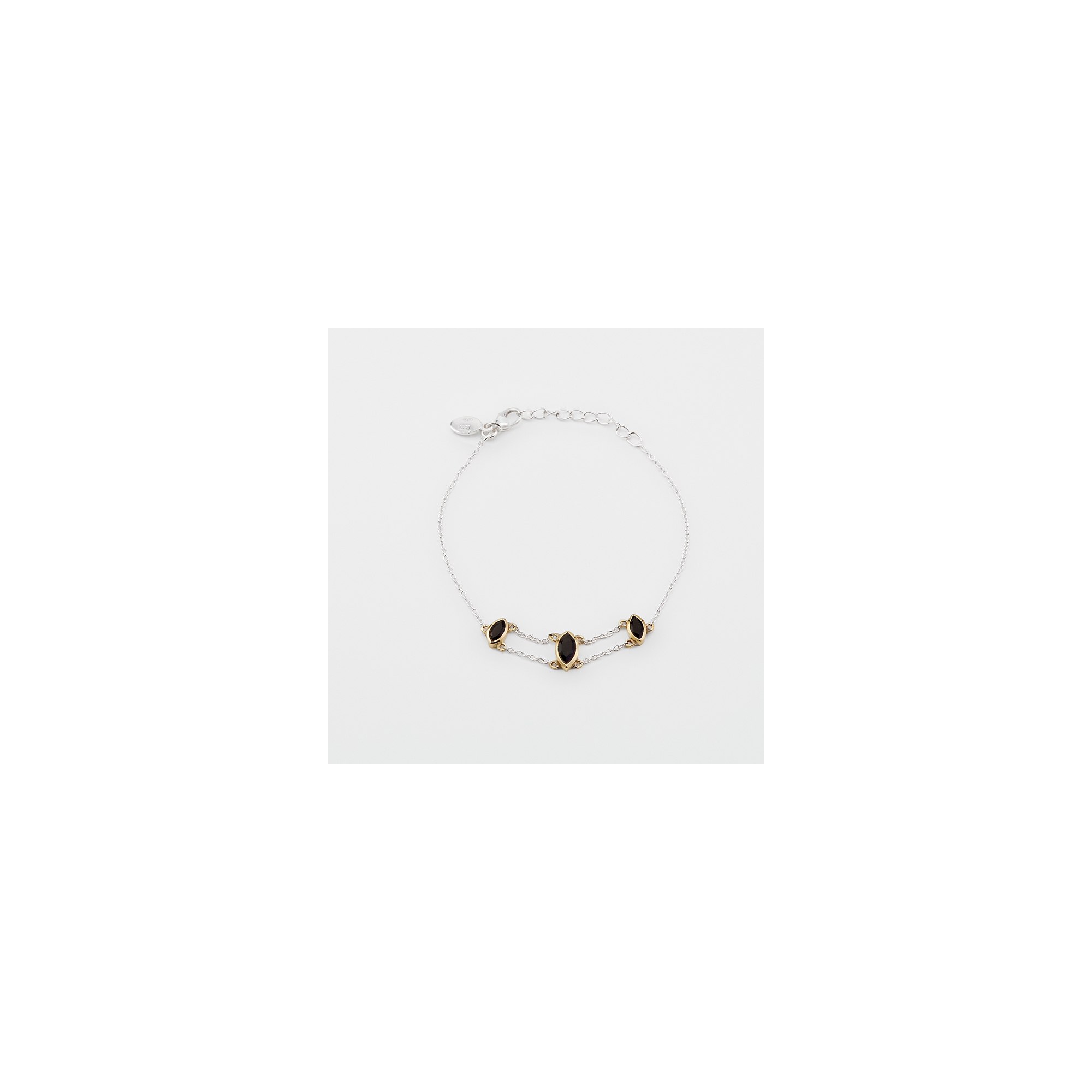 Bracelet en argent et laiton composé de 3 navettes d'onyx noir avec un sertis en laiton reliées entre elles par 2 fines chainettes.