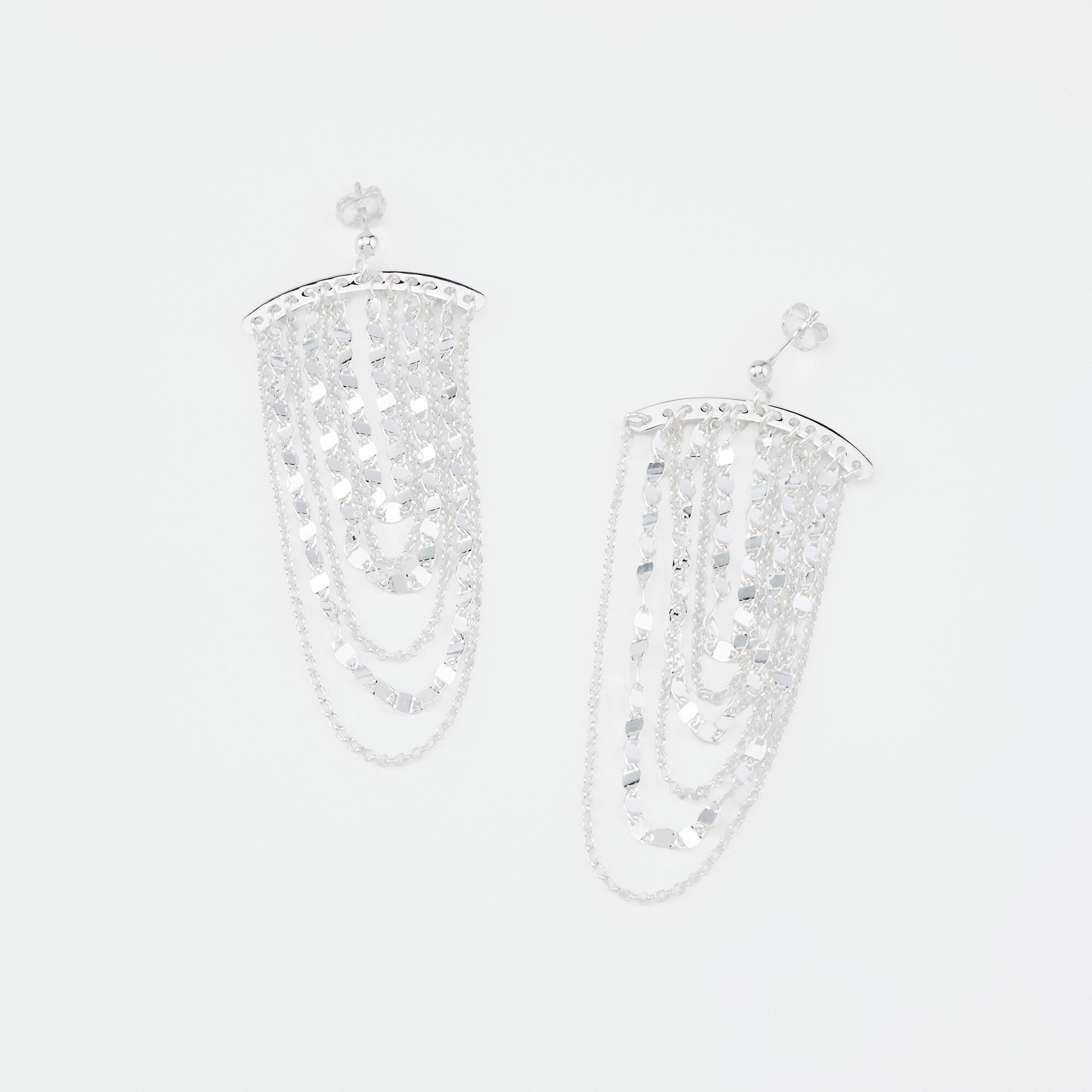 Boucles d'oreilles pendantes en argent formées par un arc décoré de chainettes longues.