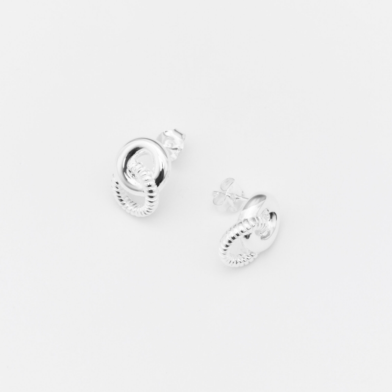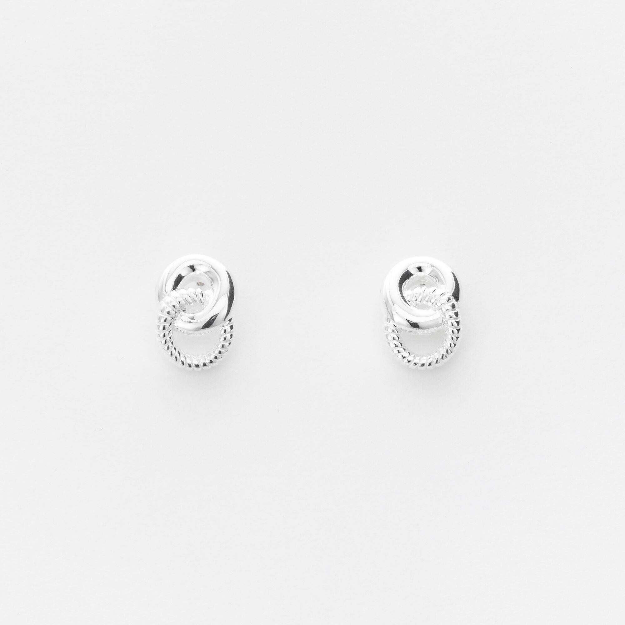Boucles d'oreilles puces en argent composées d'un anneau lisee et d'un anneau travaillé emmêlés.