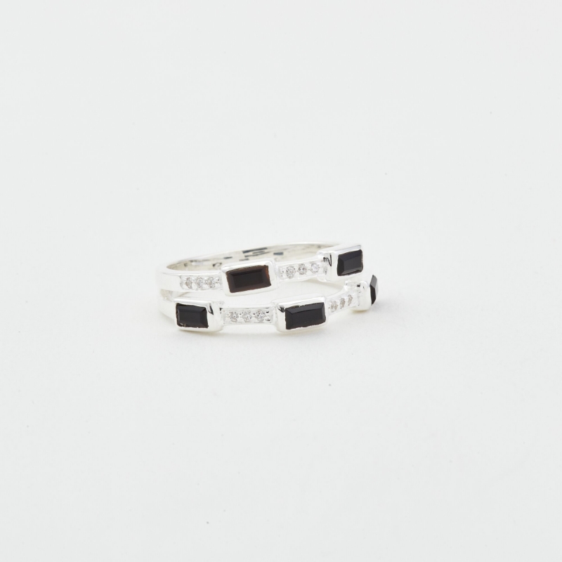 Bague alliance double en argent décorée de 5 onyx noirs rectangles séparés par de petits oxydes blancs.