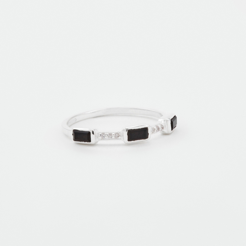Bague alliance en argent décorée de 3 onyx noirs rectangles séparés par de petits oxydes blancs.