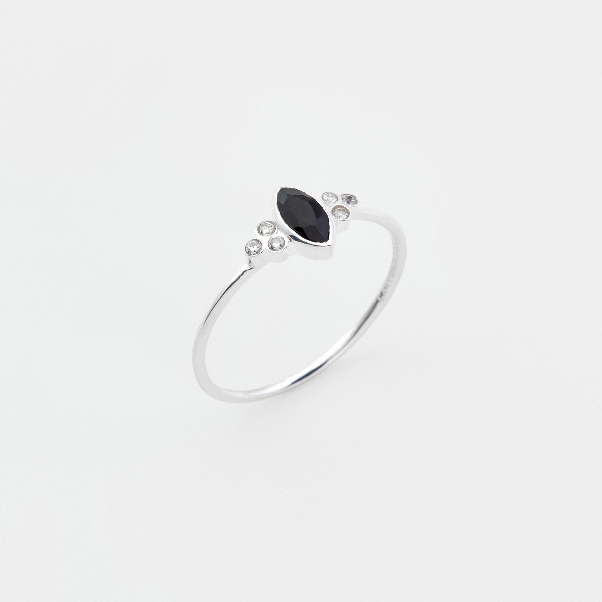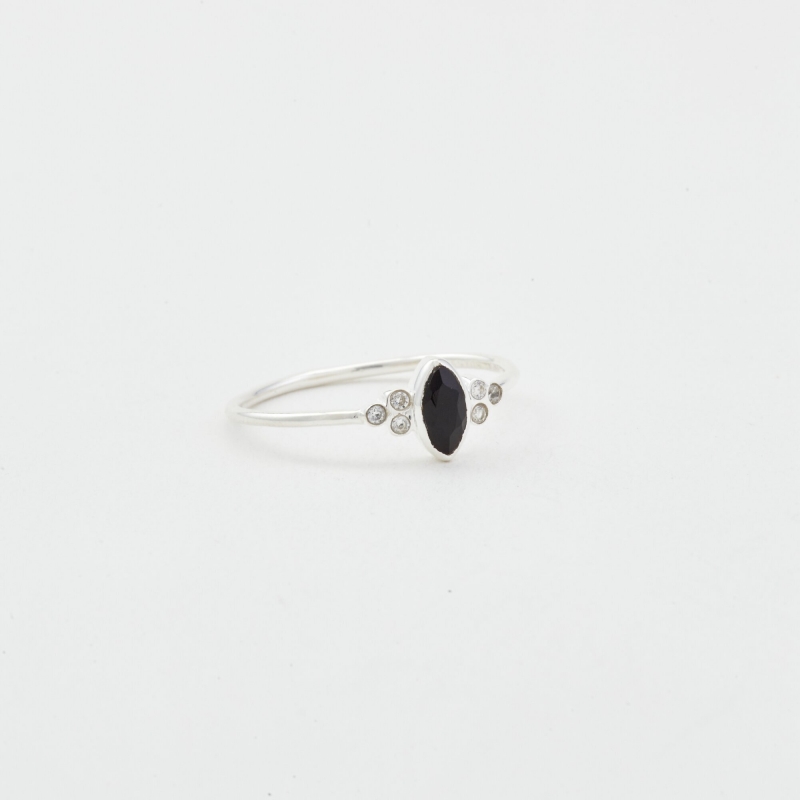 Bague en argent composée d'un anneau argent et d'une pierre en forme de navette décorée de 6 mini onyx vert.