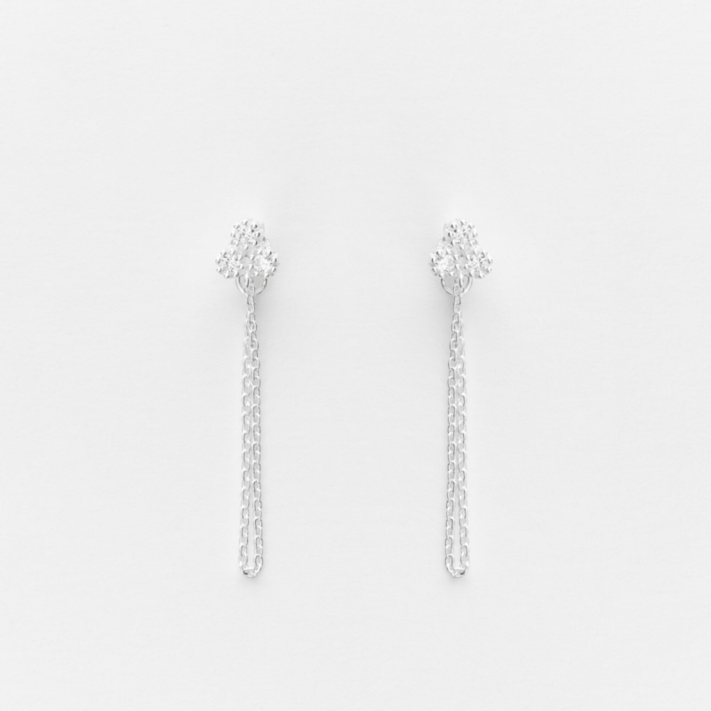 Boucles d'oreilles pendantes en argent avec 3 petits rons disposés en triangle d'un côté et arrivant à la base de la poussette de l'autre.