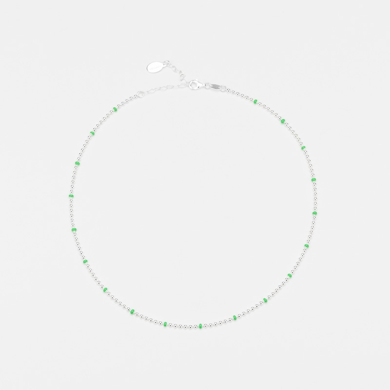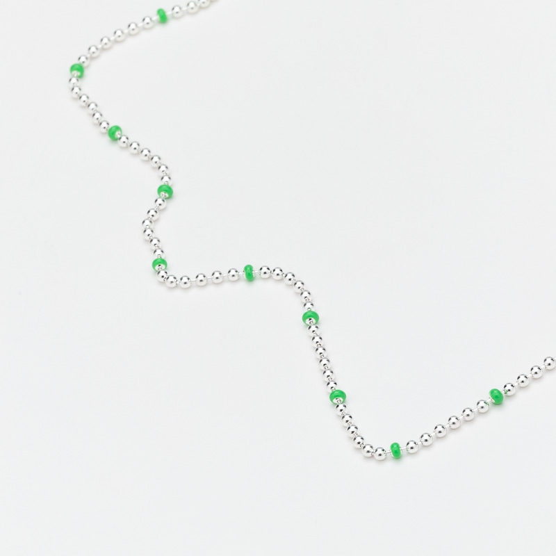 Collier en argent constitué d'une chainette de microboules dont certaines décorée de laque verte.