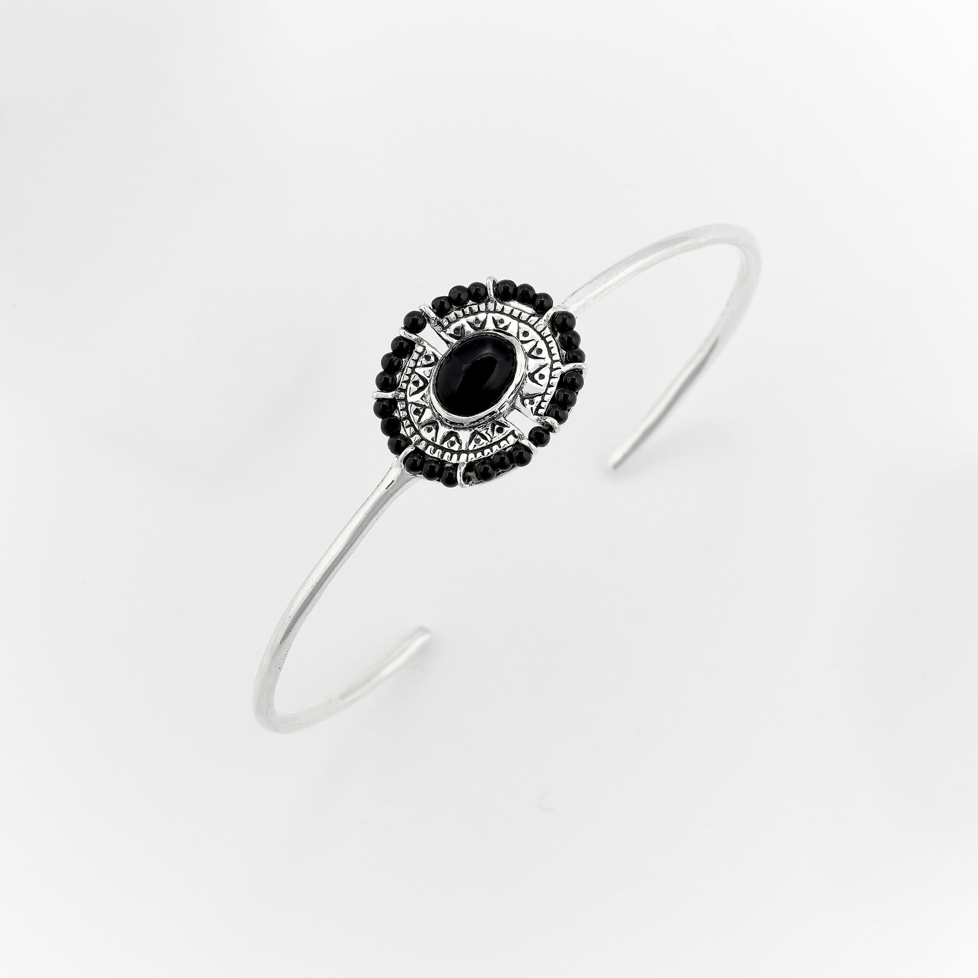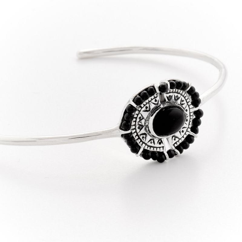 Bracelet bangle en argent composé d'un onyx noir ovale au centre entouré d'une bande d'argent gravé et de mini boules d'onyx noir sur un fin jonc lisse.