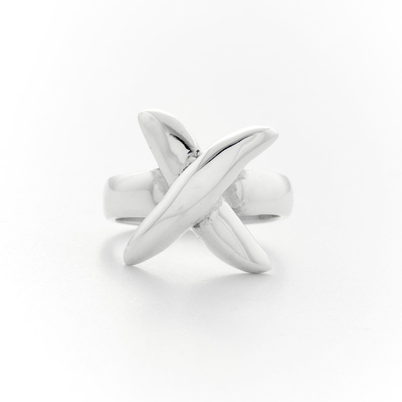 Bague en argent composée d'un anneau lisse et décoré d'un X légèrmeent bombé aux extremités pointues.