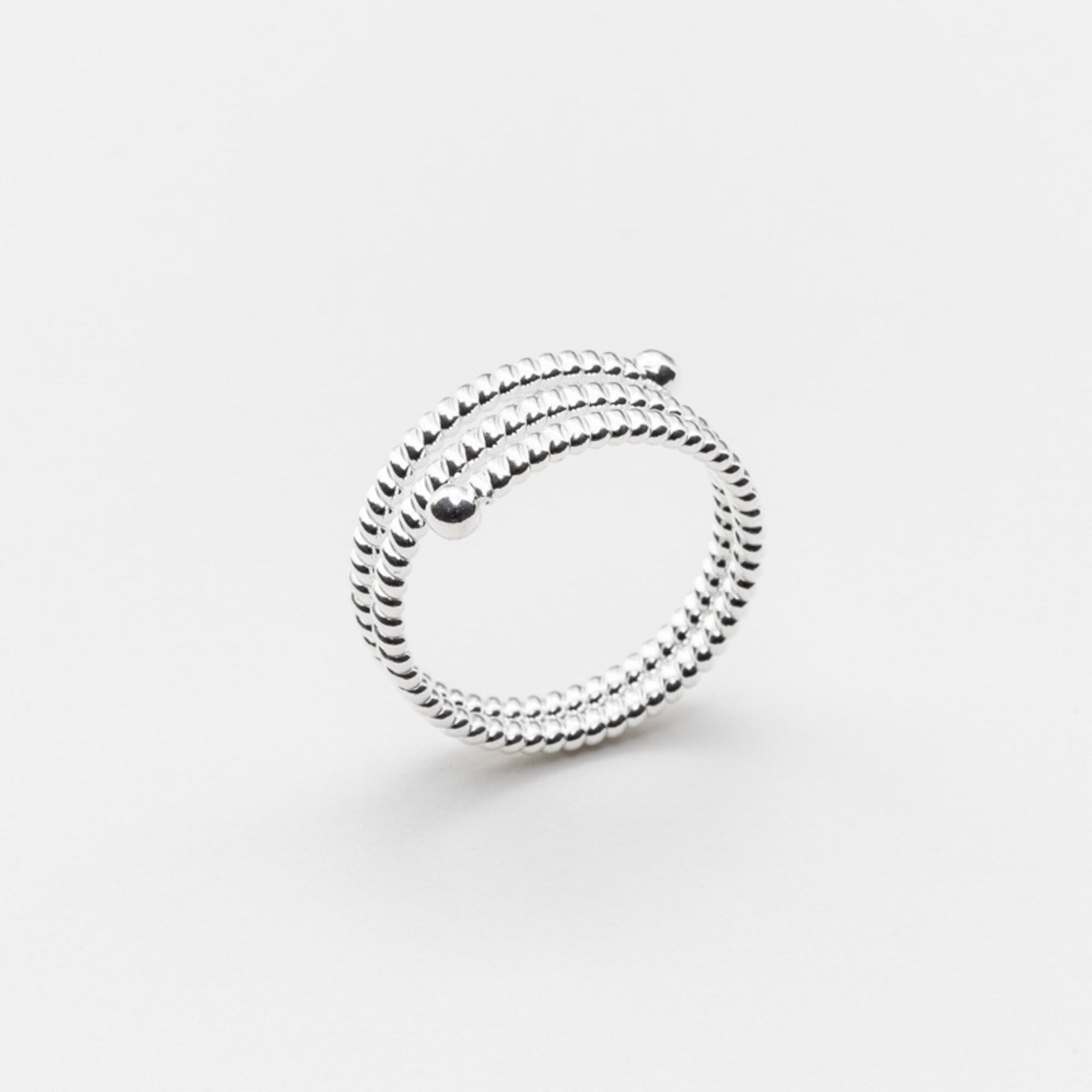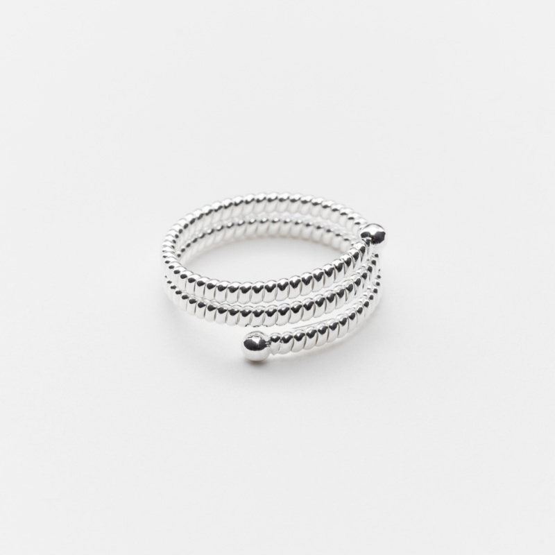 Bague en argent formée par un anneau fin à godron qui s'enroule et se termine par 2 petites boules.