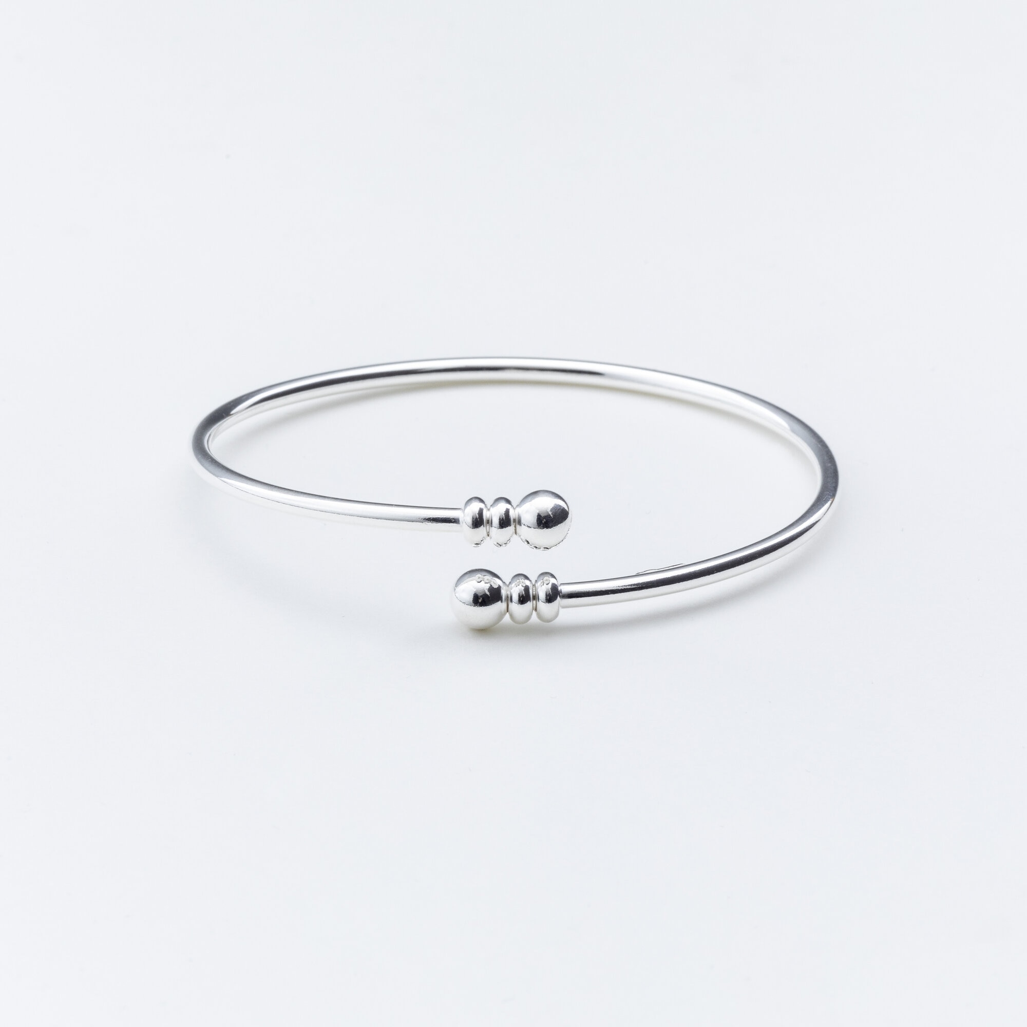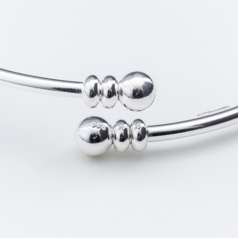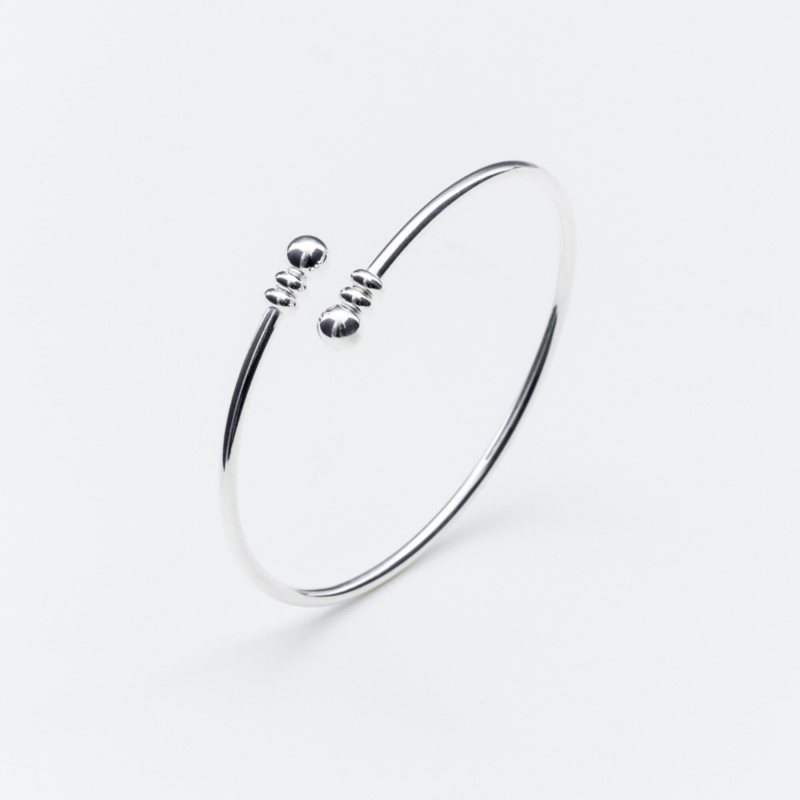 Bracelet en argent constitué d'un jonc souple ouvert se croisant avec une boule et 2 disques à chaque extrémité.