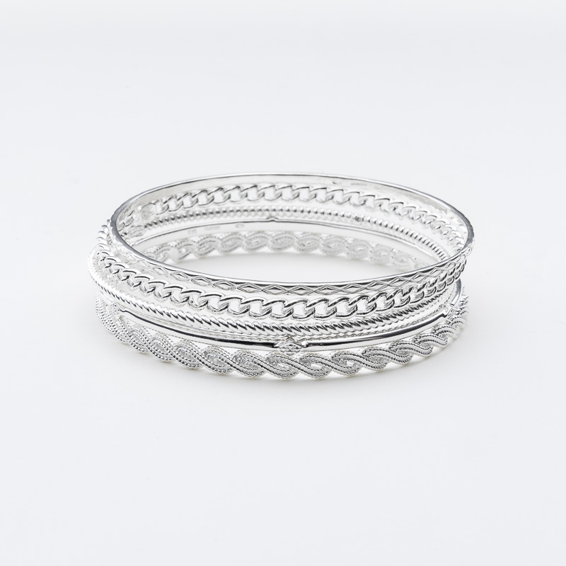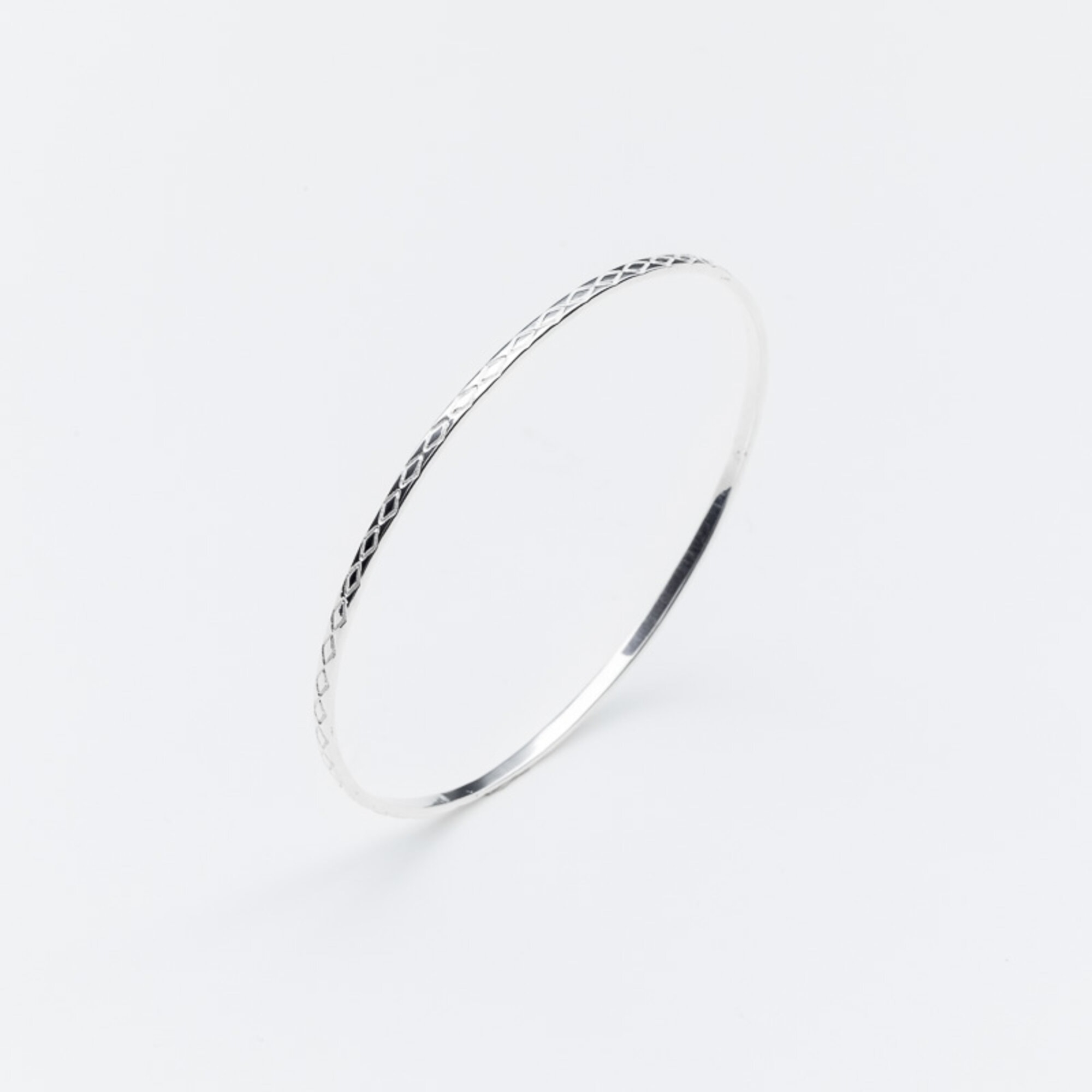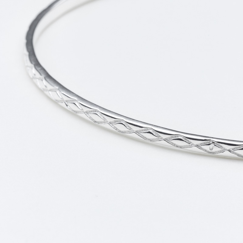 Bracelet bangle rond en argent décoré de petits traits en forme de losange.