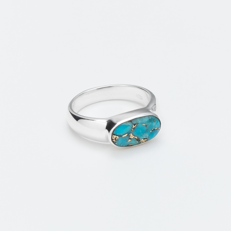 Bague en argent décorée d'une copper turquoise ovale horizontale.
