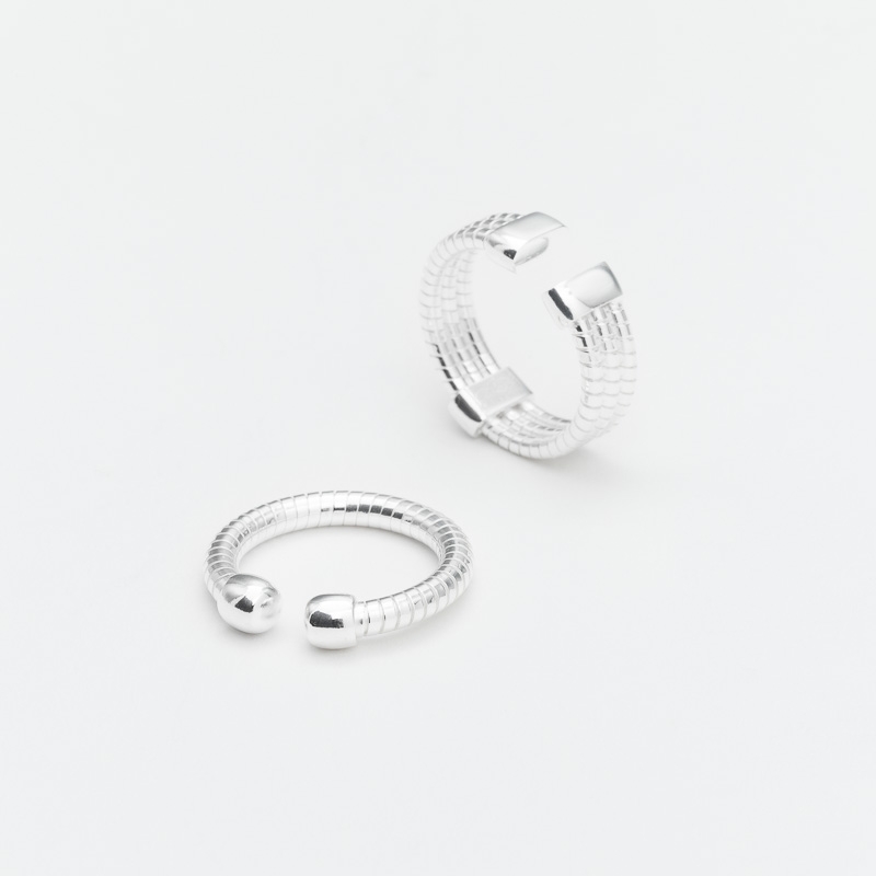 Bague en argent formée par 2 fins anneaux articulés toi et moi qui se termine par 2 petites pièces rectangulaires.