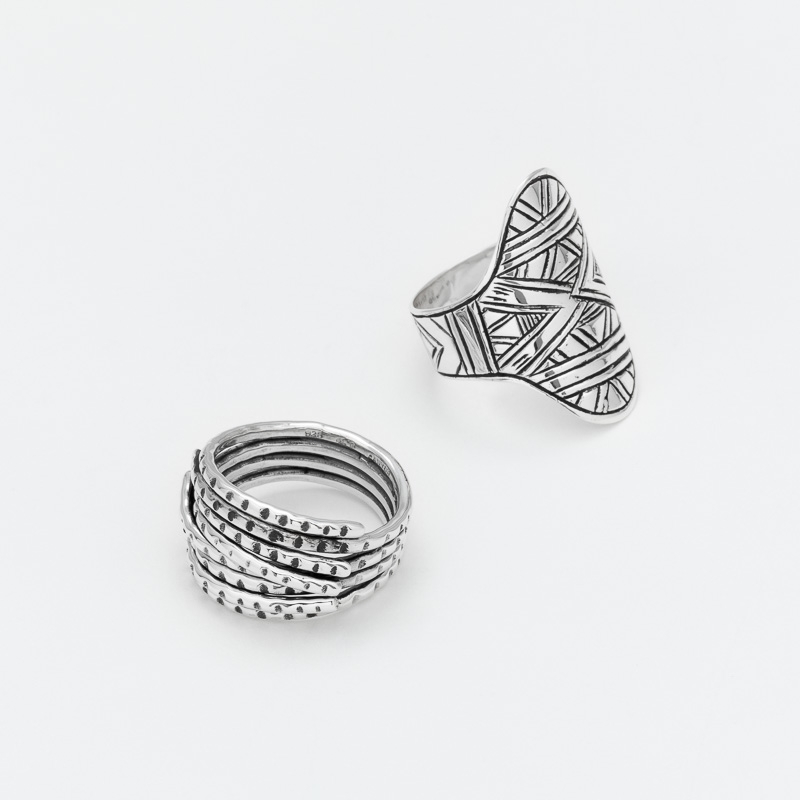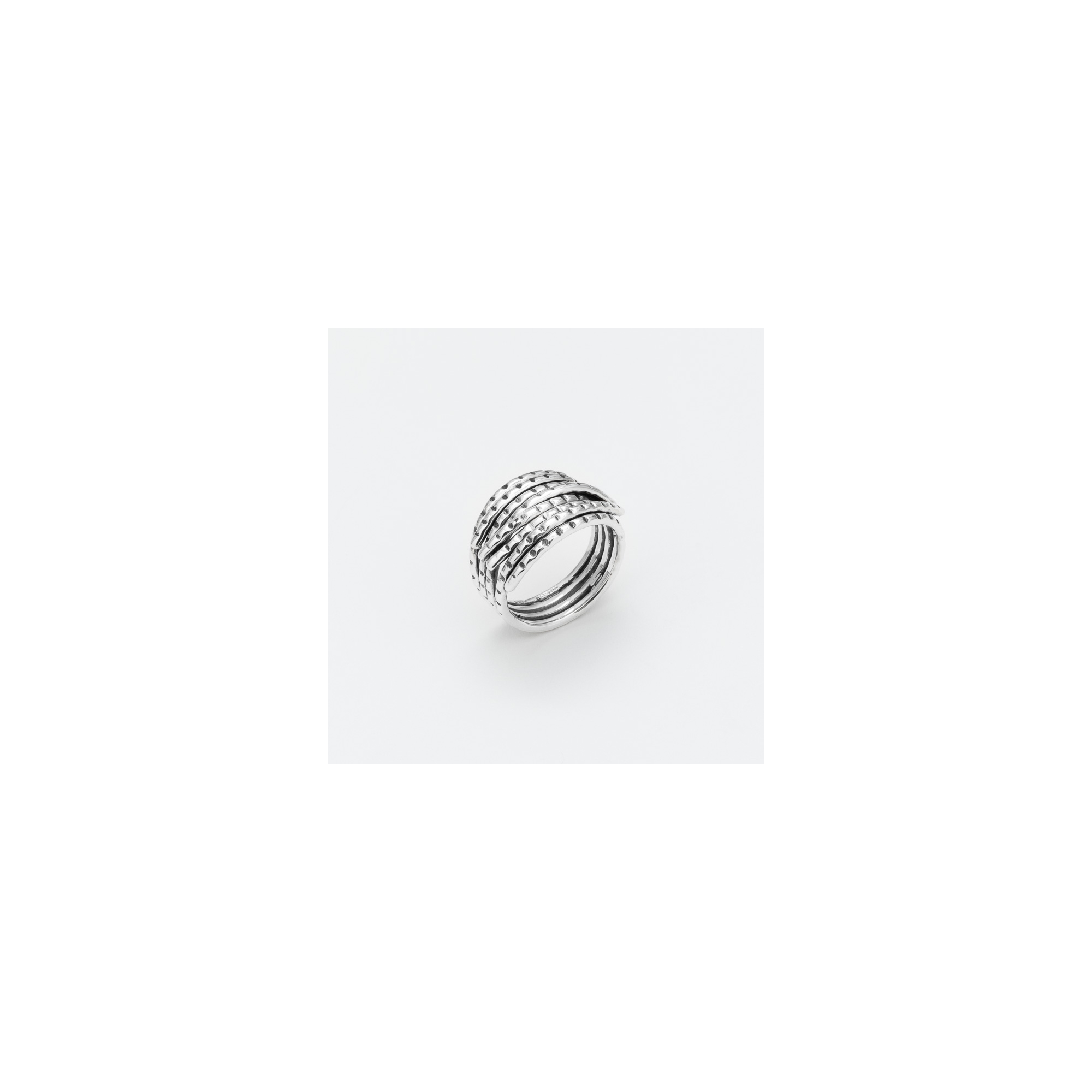 Bague en argent légèrement oxydé vieilli formée par 7 anneaux emmêlés décoré par des mini rectangles