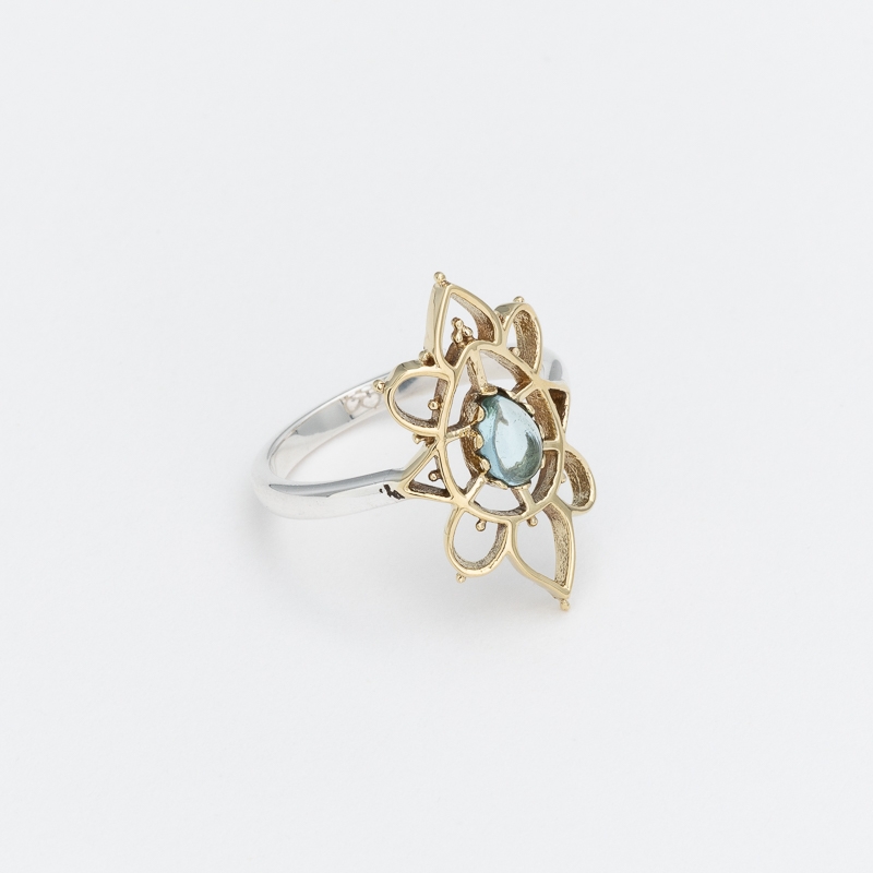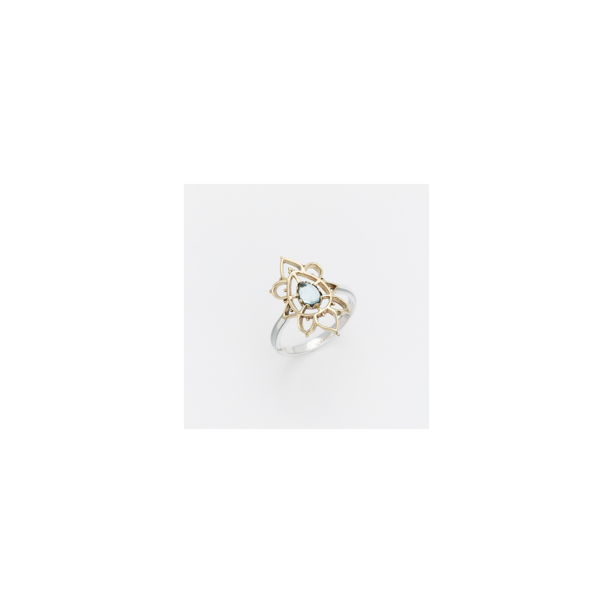 Bague bicolore formée d'une rosace de laiton avec en son centre un cabochon ovale de verre couleur bleu topaze sur un fin anneau argent.