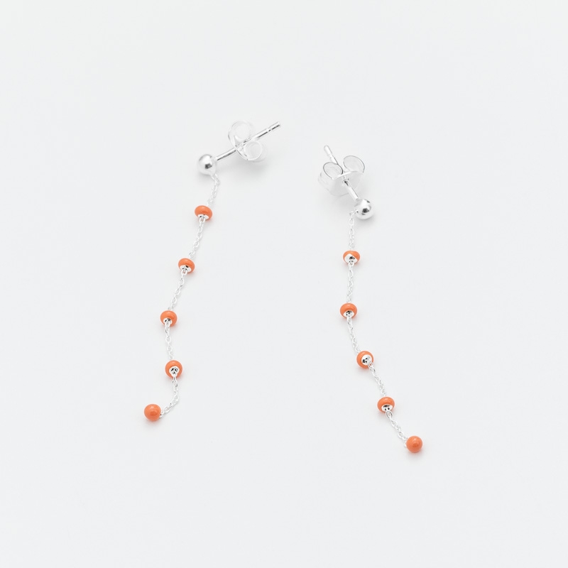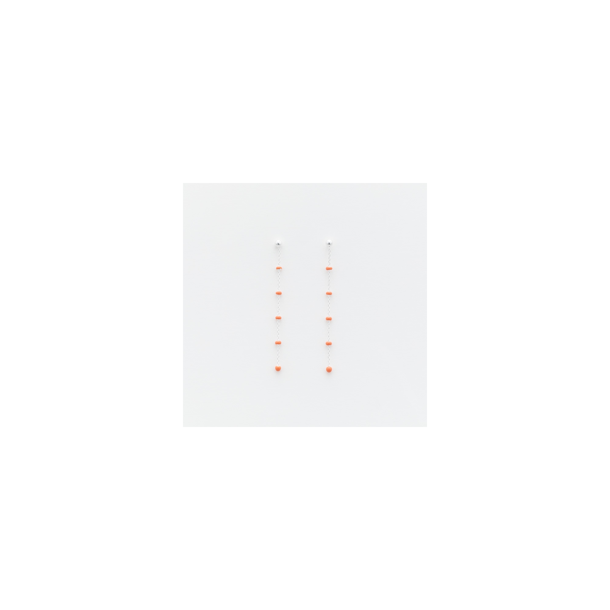 Boucles d'oreilles en argent pendantes composées d'une chainette décorée de 5 microboules de laque rose.