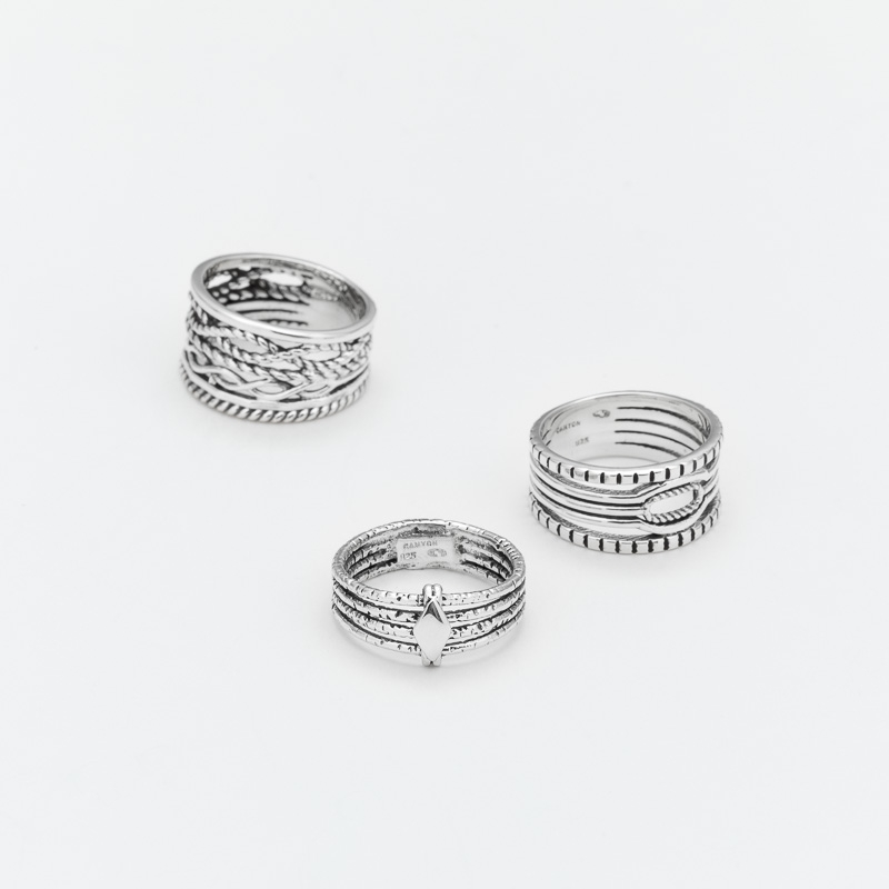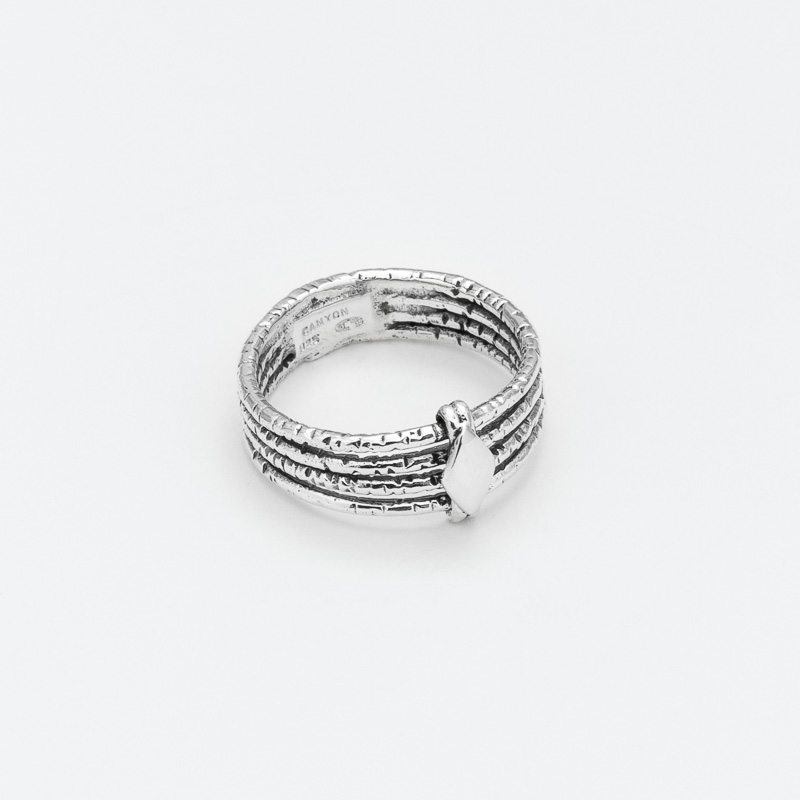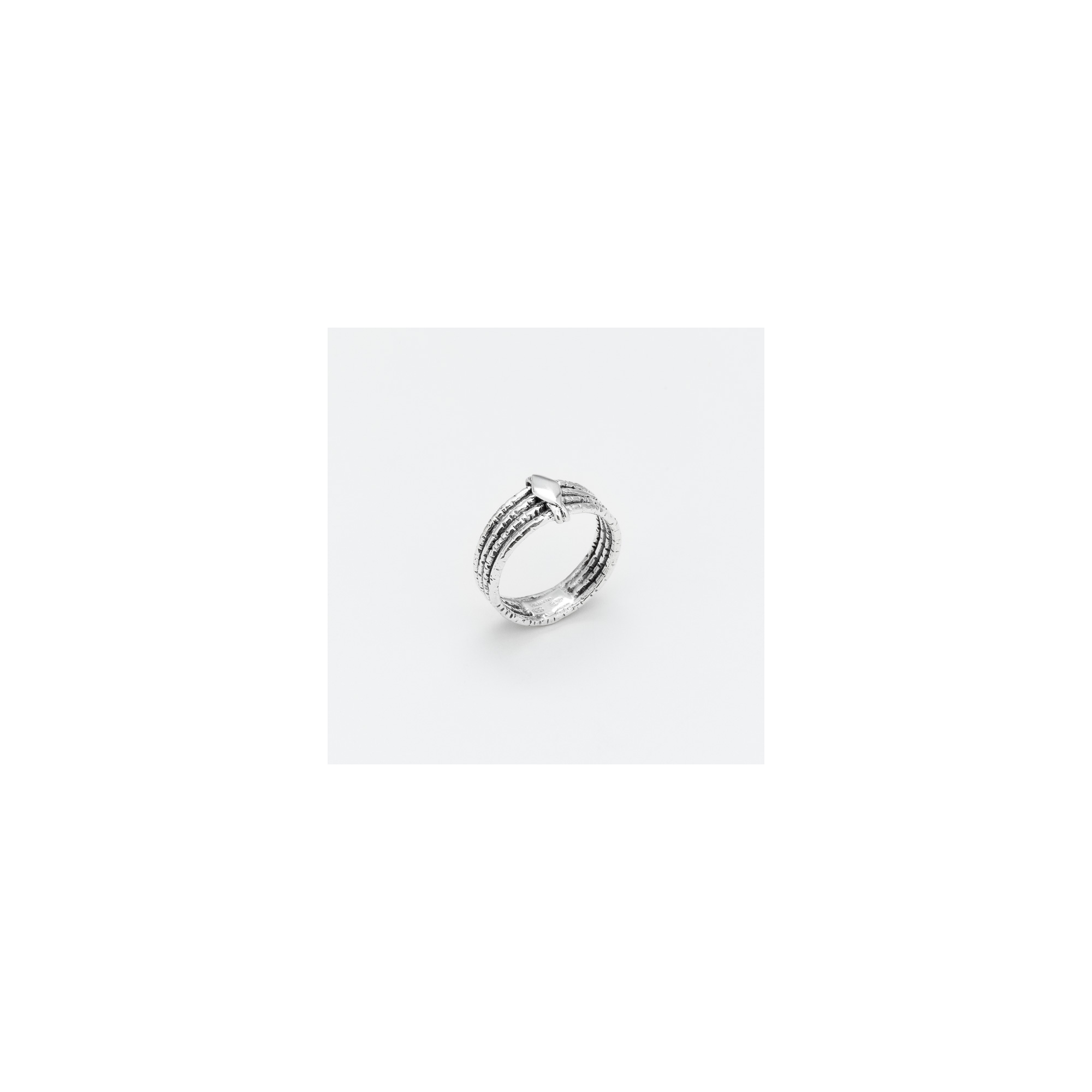 Bague en argent légèrement oxydé vieilli formée par 4 fils fins travaillés et décorés au centre par un ovale
