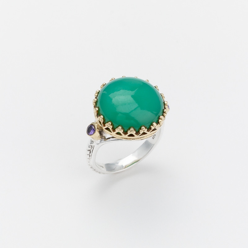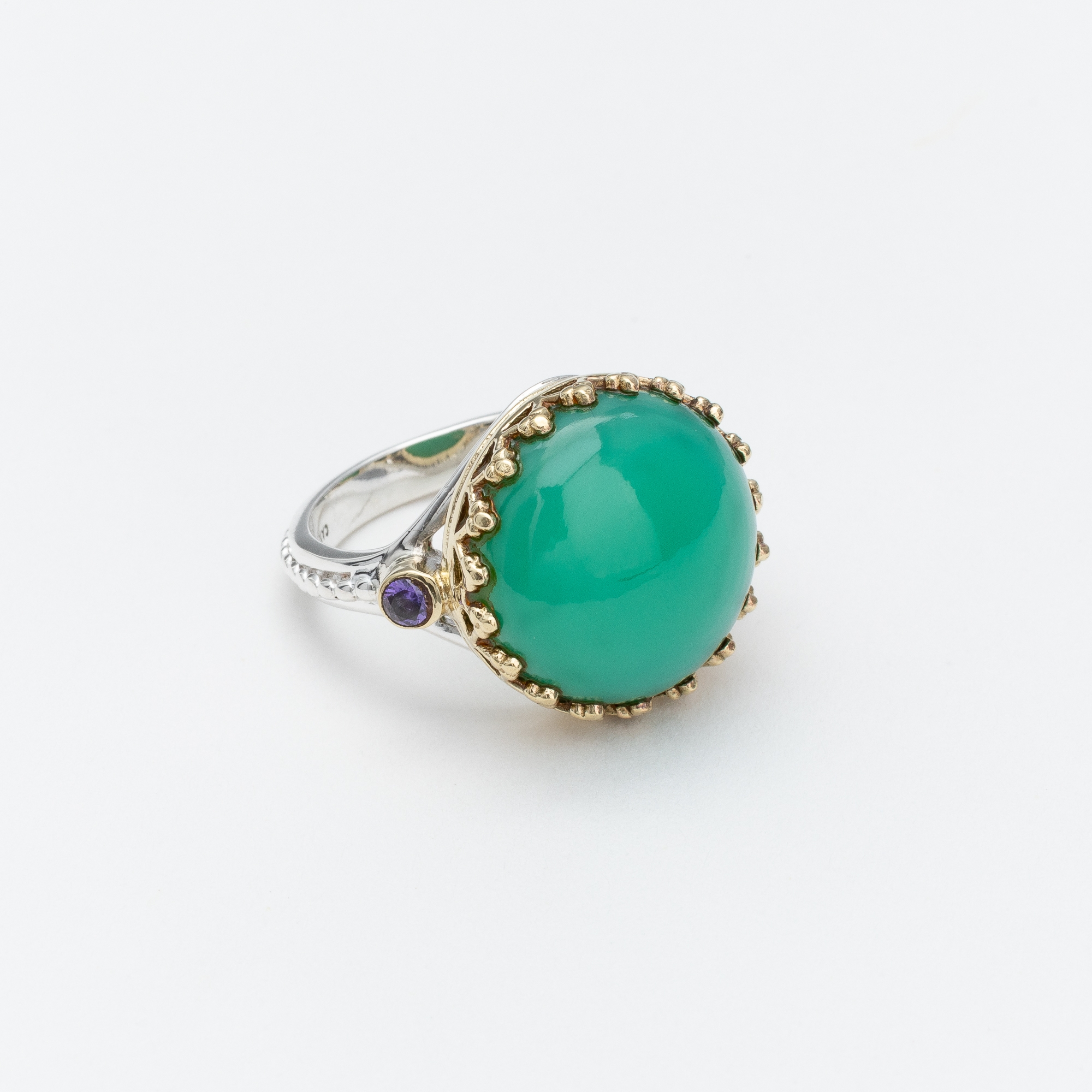 Bague bicolore formée d'un rond de chrysoprase avec de chaque côté un petit oxyde améthyste rond tous sertis de laiton sur un fin anneau argent décoré de microboules.