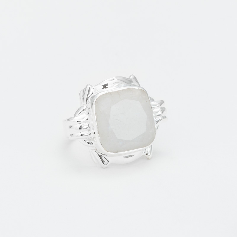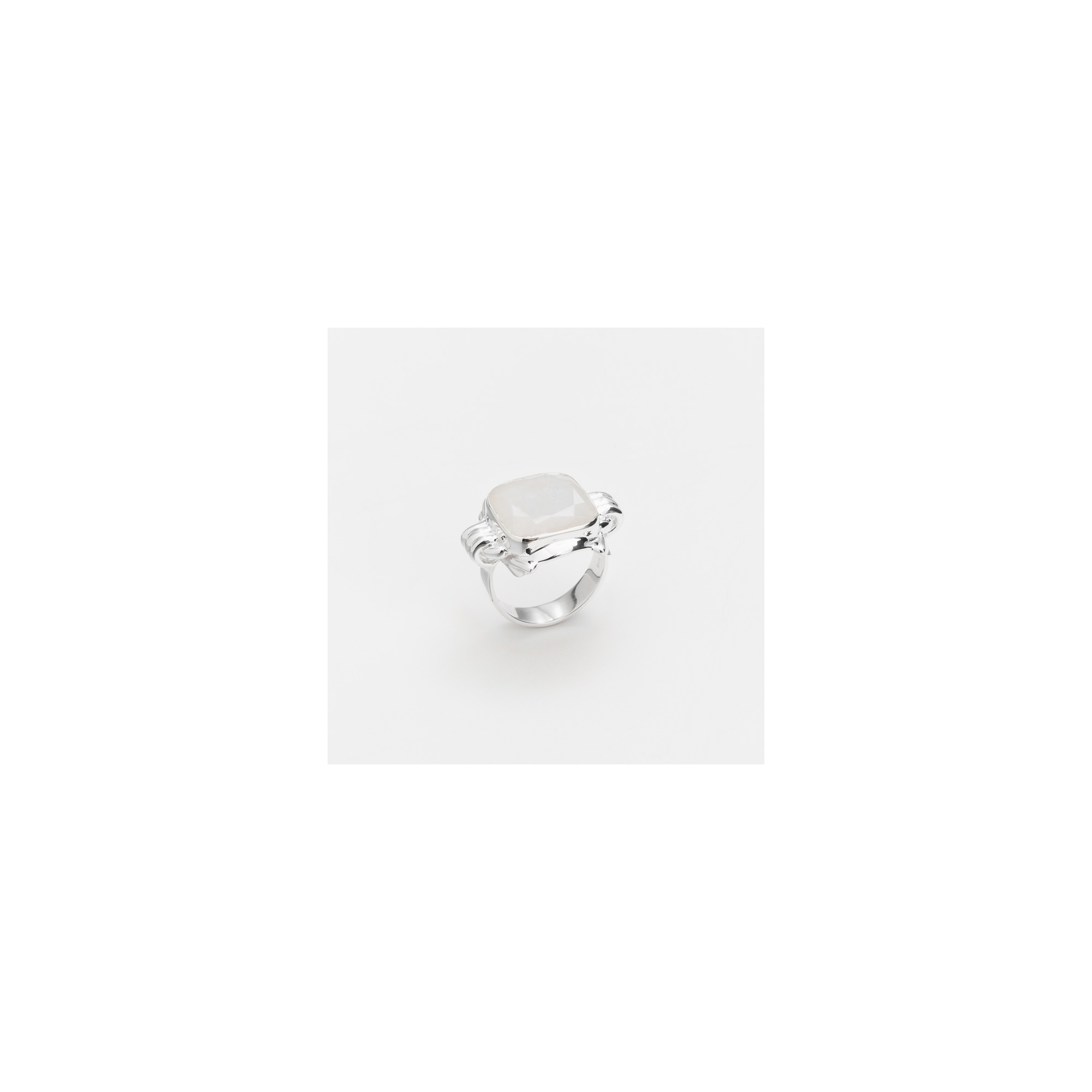 Bague en argent composée d'une pierre de lune carré décorée de 3 godrons de chaque côté.