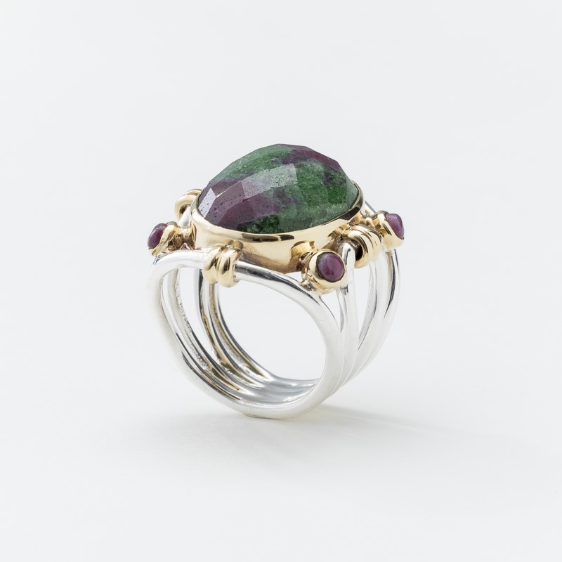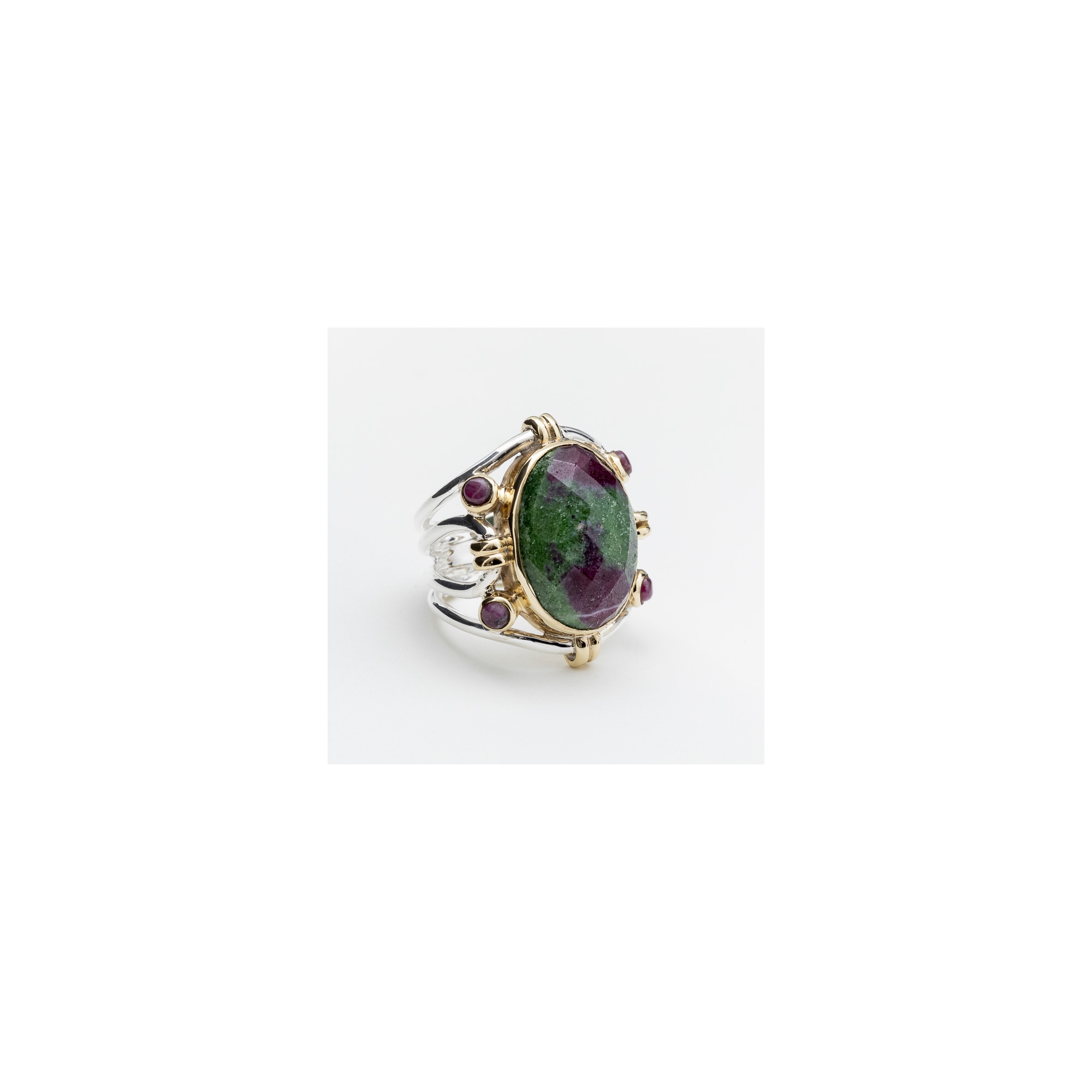 Bague argent et laiton composée d'un anneau argent composé de 4 fils et d'un grand ovale de rubis zoisite et de 4 petits tous sertis de laiton .