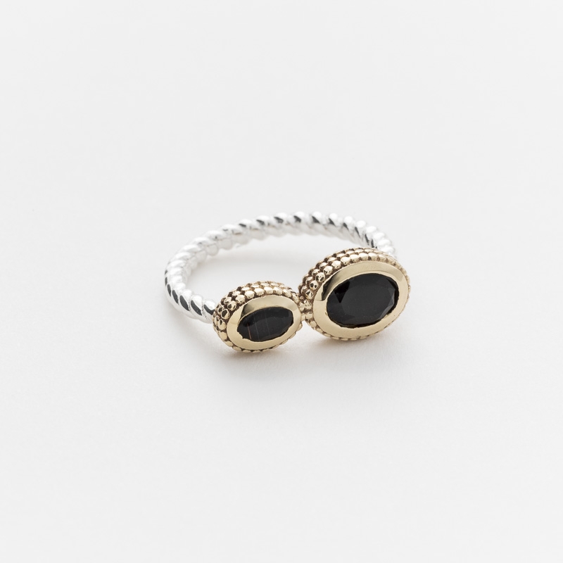 Bague argent et laiton composée d'un anneau argent torsadé et de 2 ovales d'onyx noir avec un sertis en laiton formé de 3 rangs de microboules.