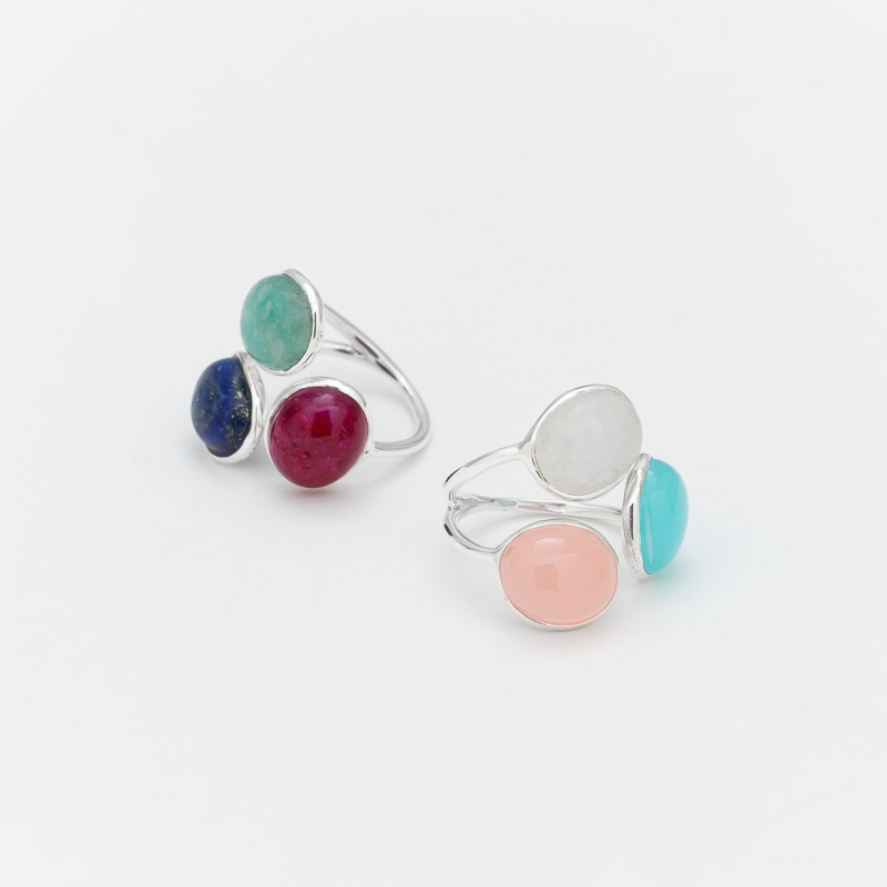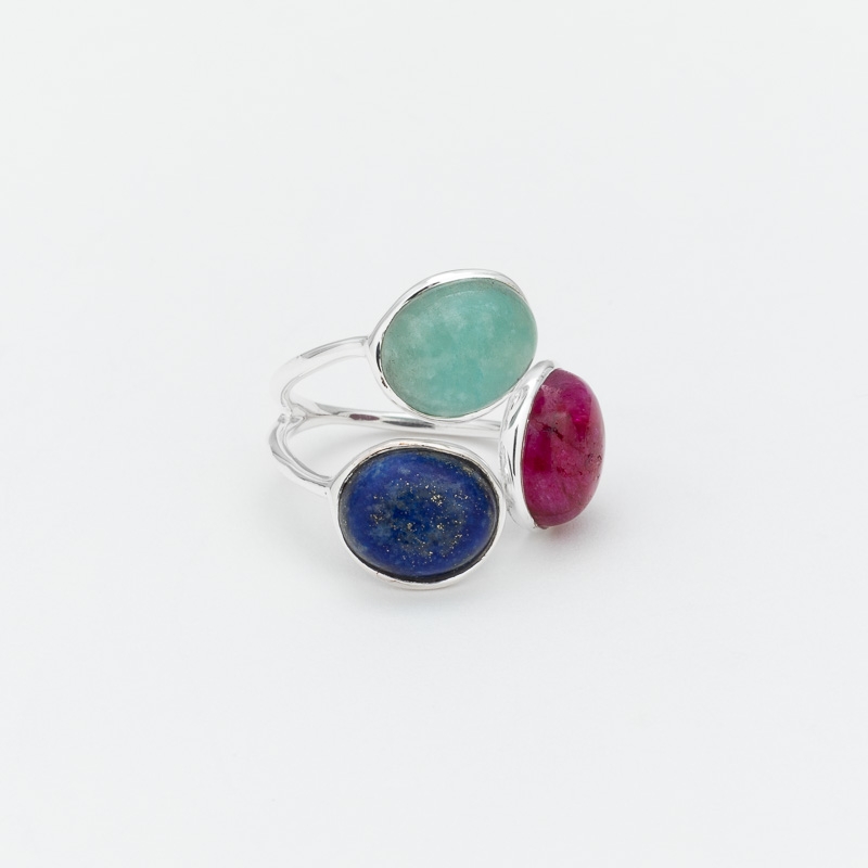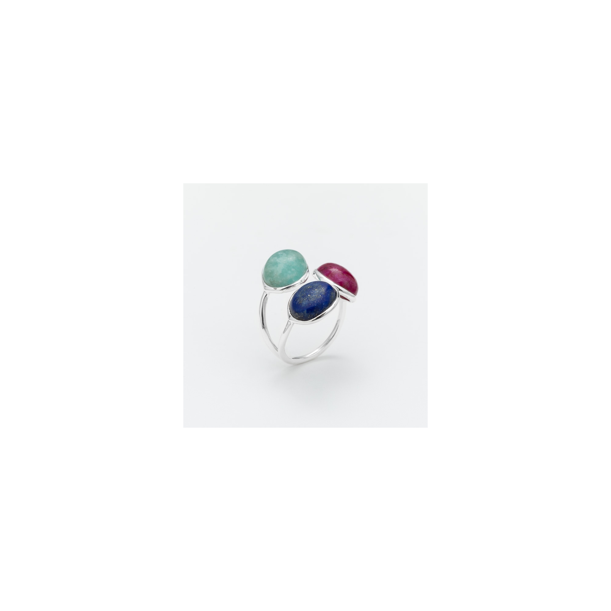 Bague en argent toi et moi composée de 3 pierres différentes sur celle-ci une amazonite un lapis et un rubis indien