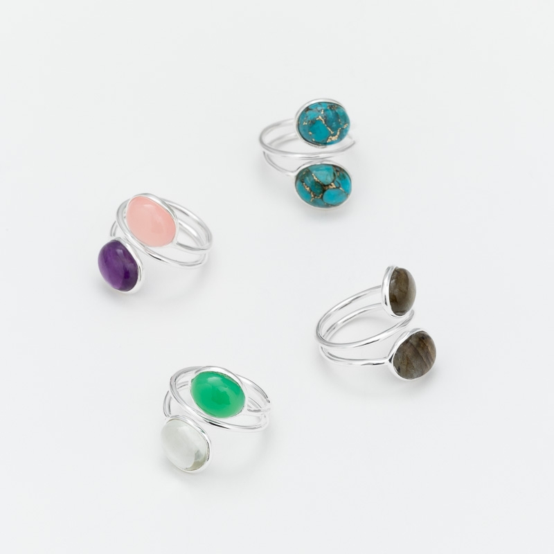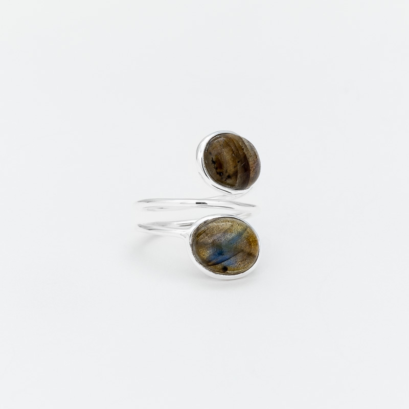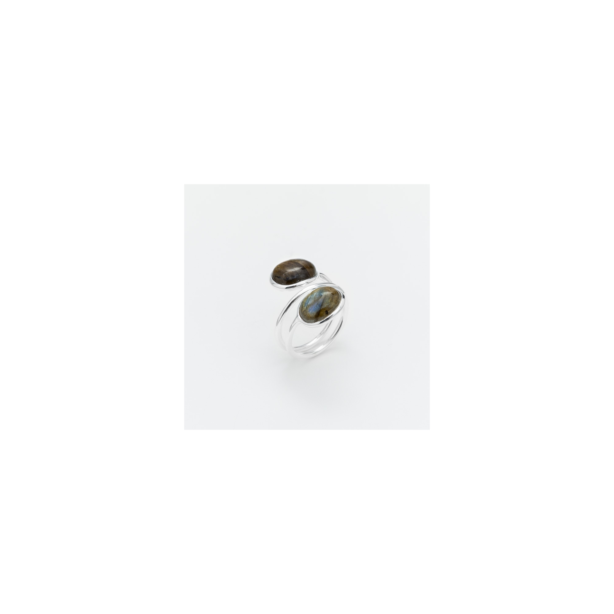 Bague en argent composée de 2 cabochons de labradorite enroulés de part et d'autre d'un anneau