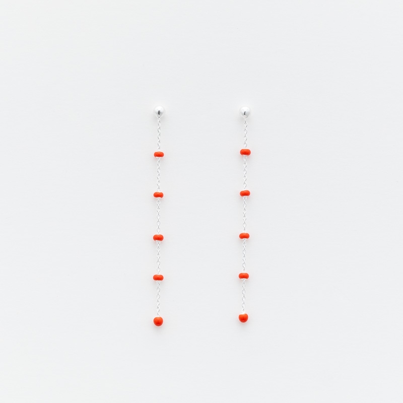 Boucles d'oreilles en argent pendantes composées d'une chainette décorée de 5 microboules de laque rouge orange.