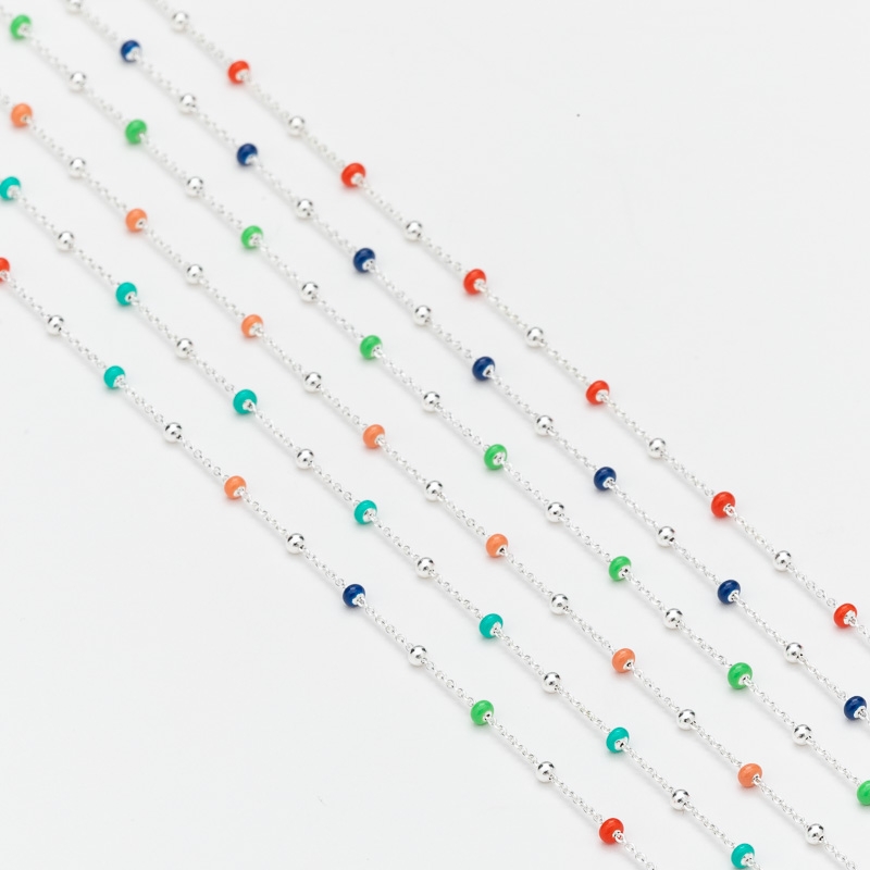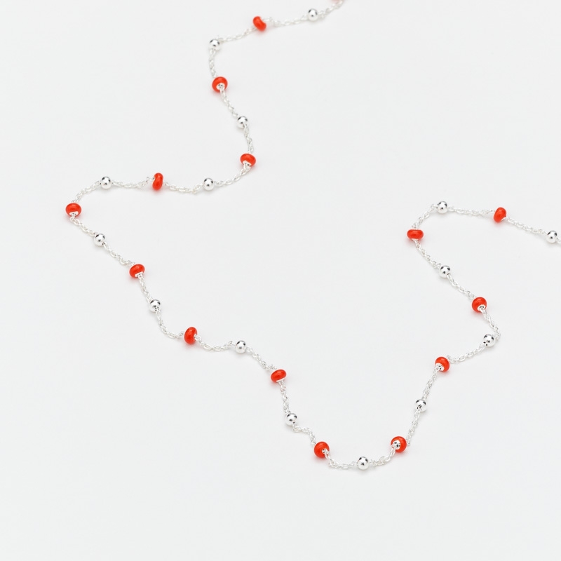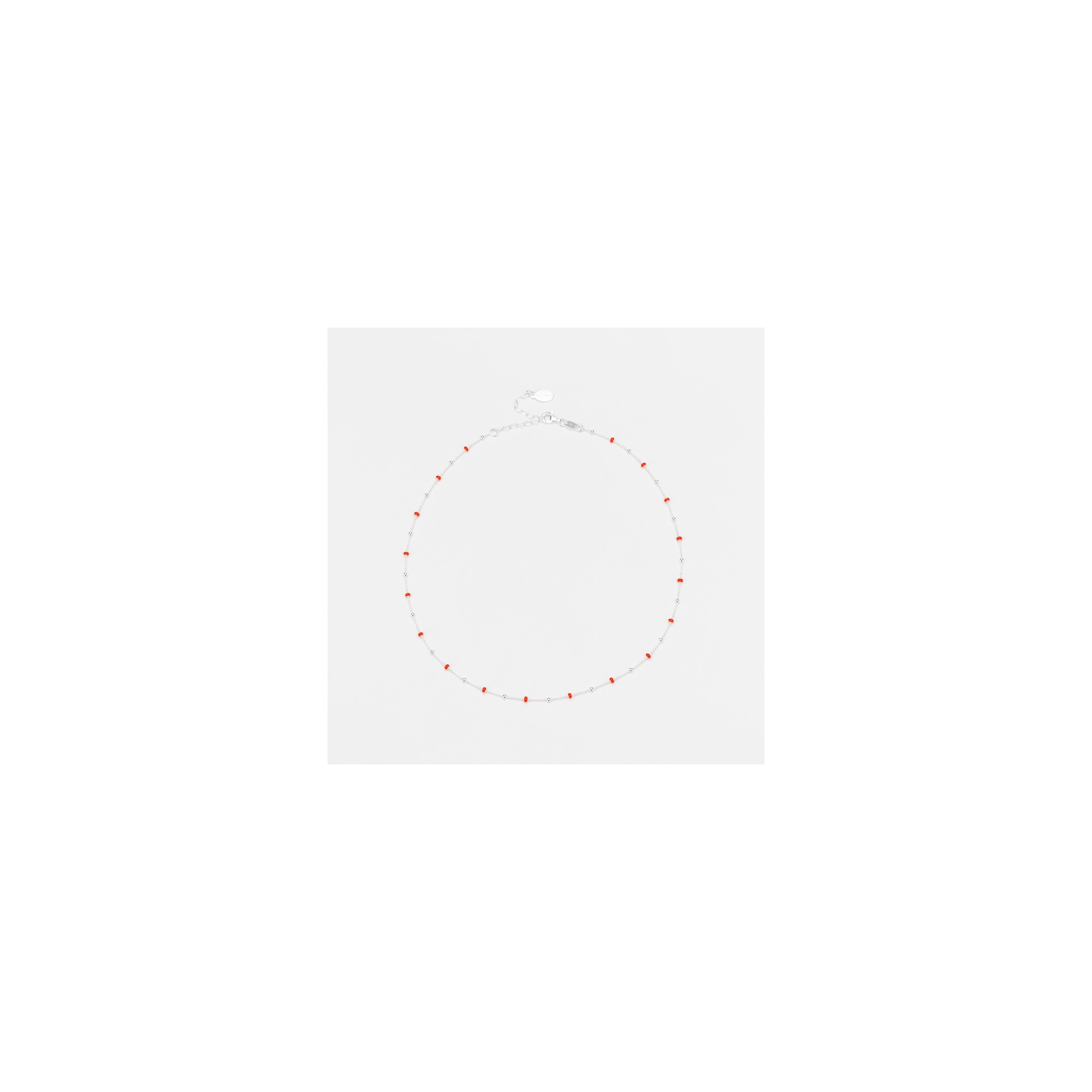 Collier en argent constitué d'une chainette décorée de microboules de laque rouge orange et de microboules argent.
