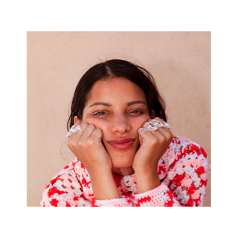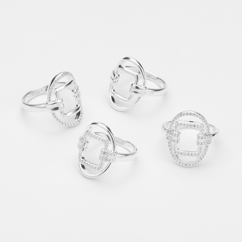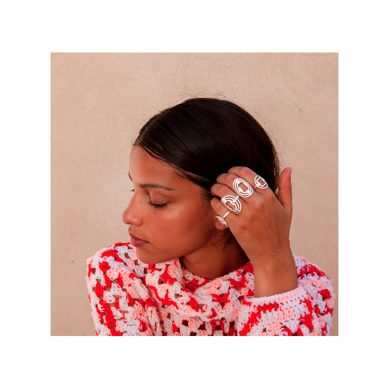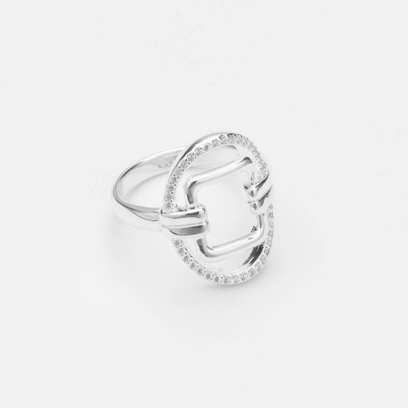 Bague en argent style Art Déco formée d'un ovale paré d'oxydes blancs et d'un carré décorés de barres tout argent
