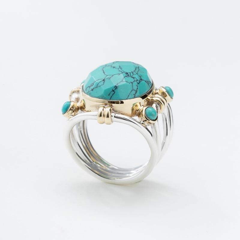 Bague argent et laiton composée d'un anneau argent composé de 4 fils et d'un grand ovale de turquoise reconstituée et de 4 petits tous sertis de laiton .