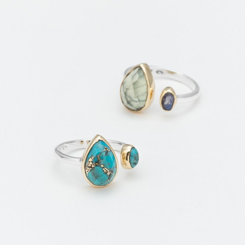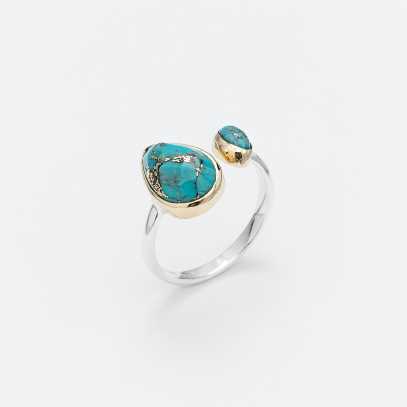 Bague en argent et laiton décorée d'une grande copper turquoise en forme de goutte et d'une petite ovale.Longueur : 1,3 cm