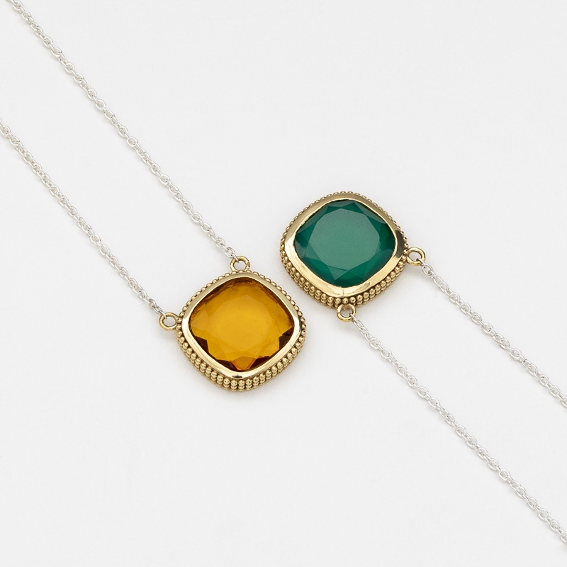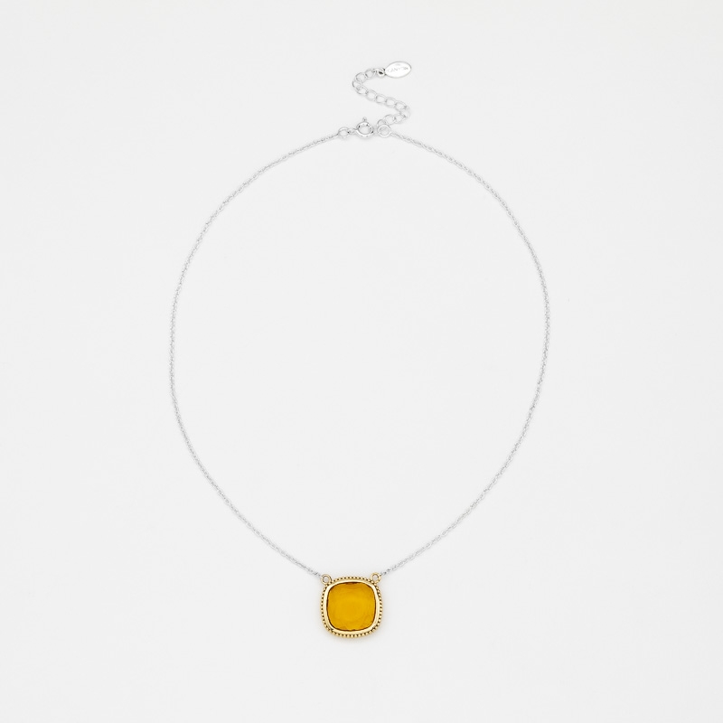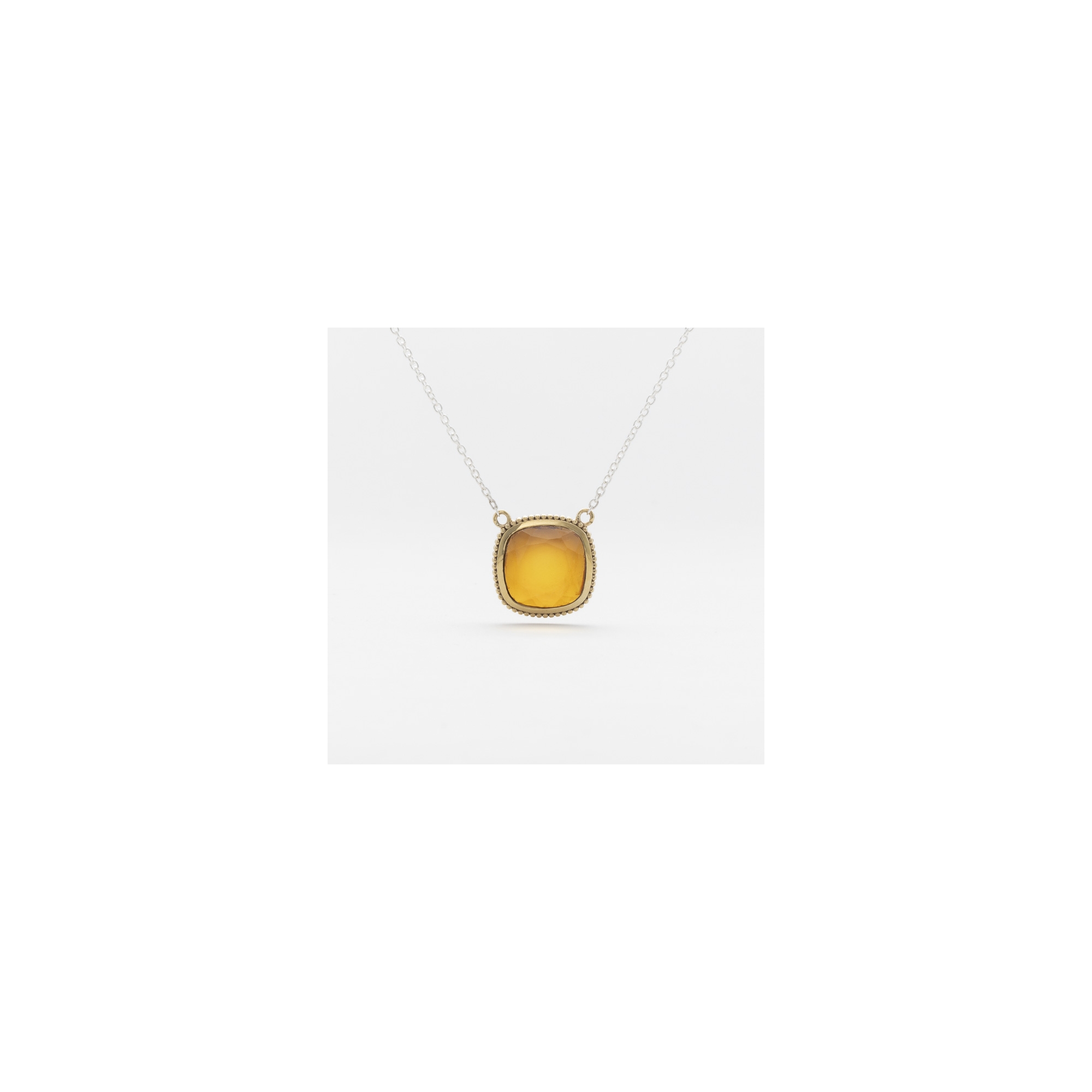 Collier en argent et laiton composé d'un carré de citrine brandy avec un serti en laiton formé de 3 rangs de microboules et d'une chainette en argent.