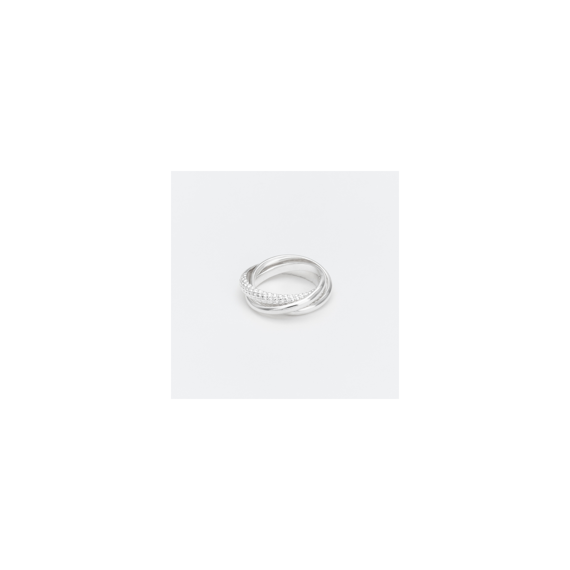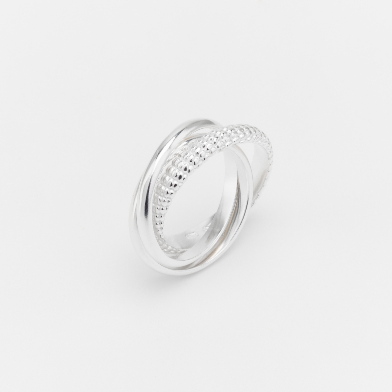 Bague en argent formée de 3 anneaux emmêlés 2 lisses et un décoré de rangs de microboules.