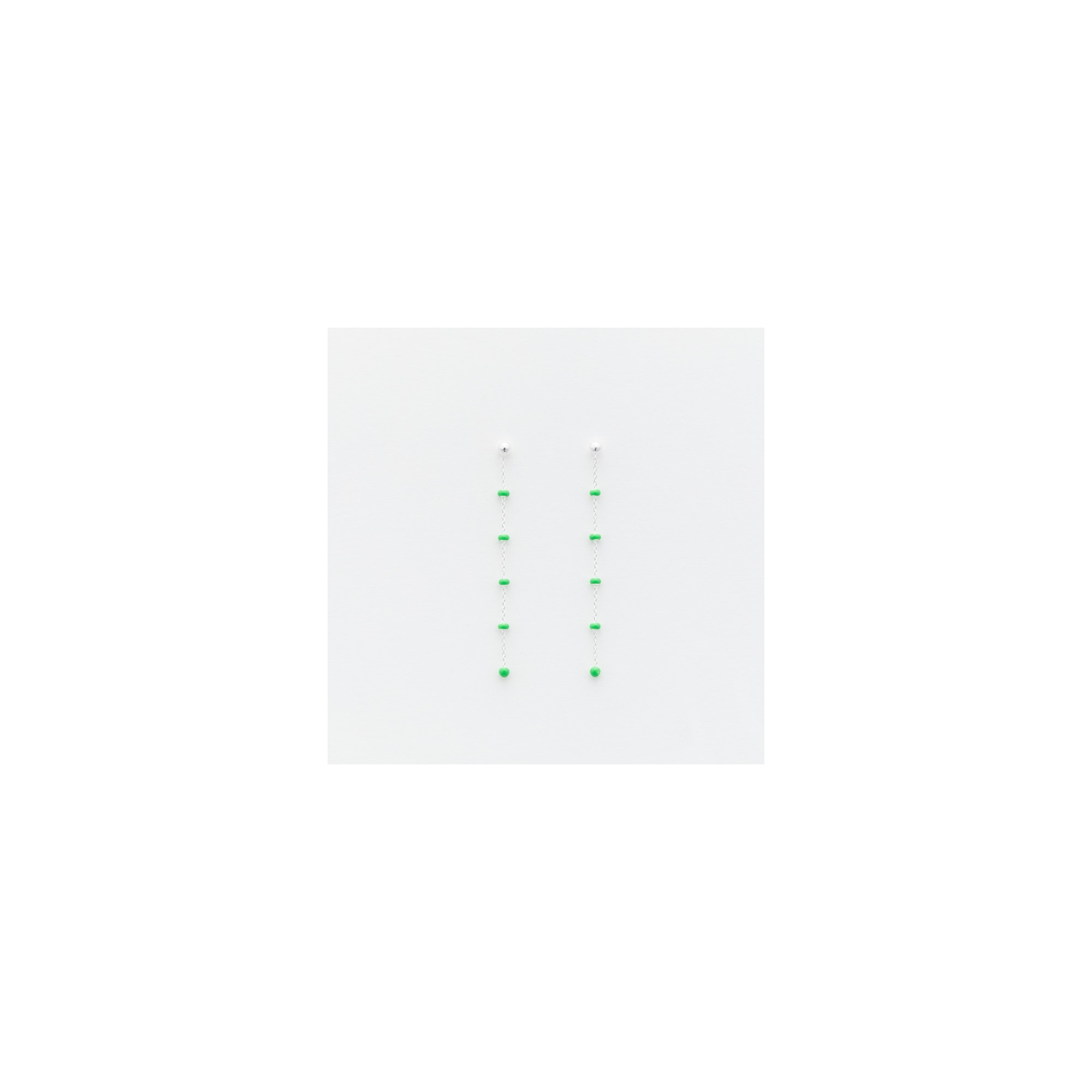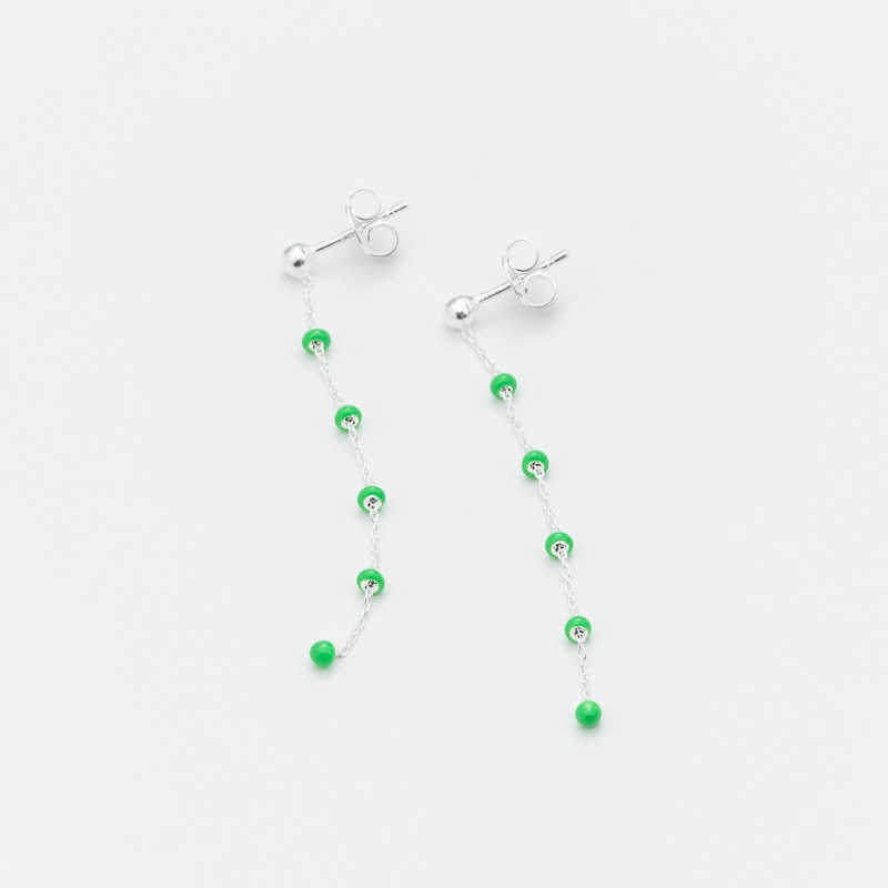 Boucles d'oreilles en argent pendantes composées d'une chainette décorée de 5 microboules de laque verte.