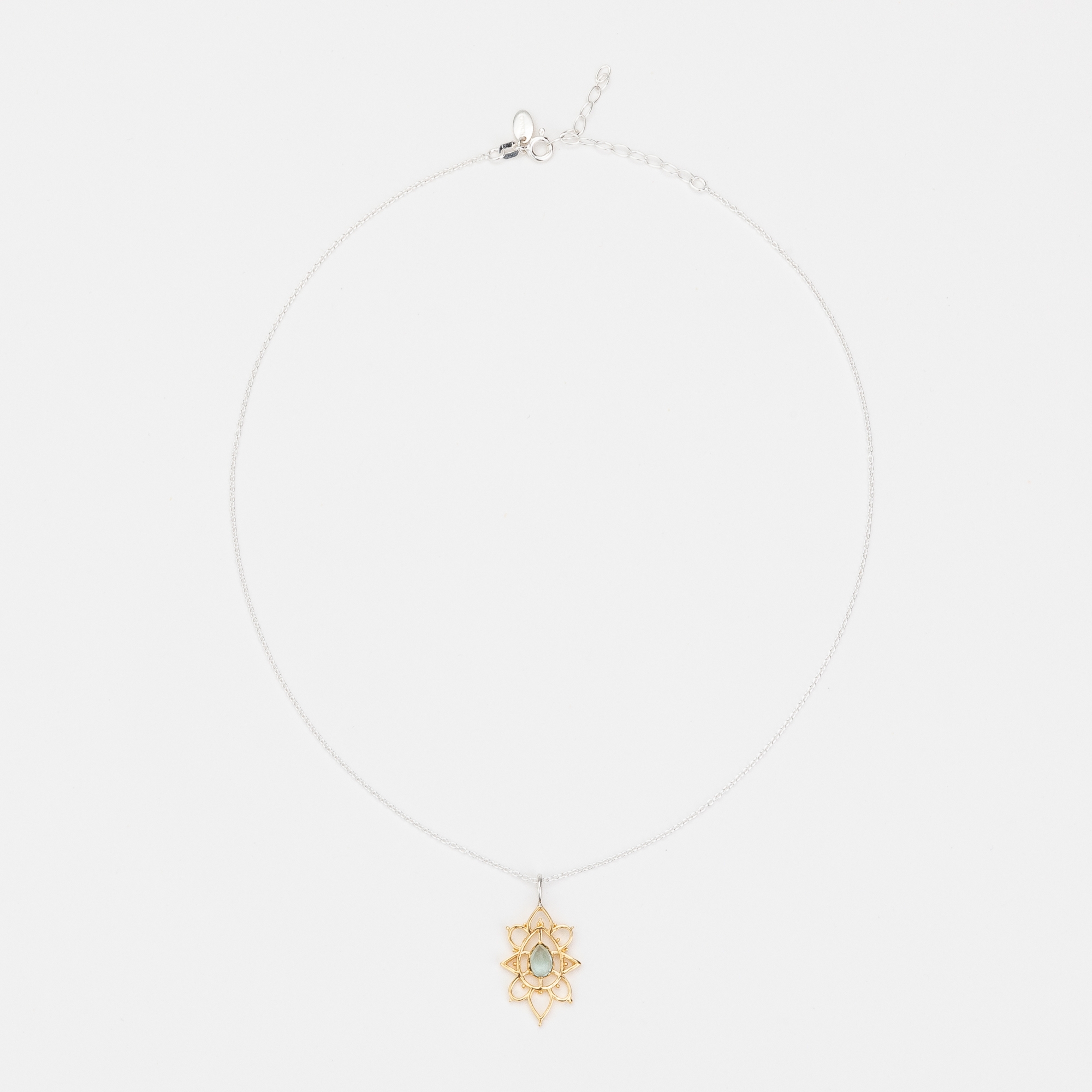 Collier en argent composé d'une rosace de laiton avec en son centre un cabochon ovale de verre couleur bleu topaze
