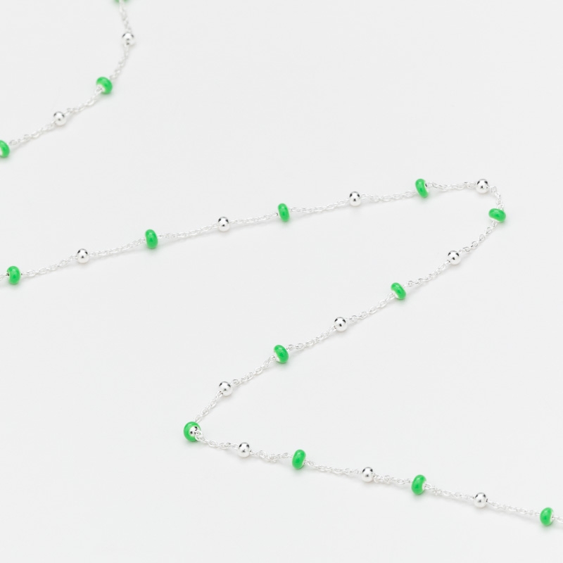 Collier en argent constitué d'une chainette décorée de microboules de laque verte et de microboules argent.