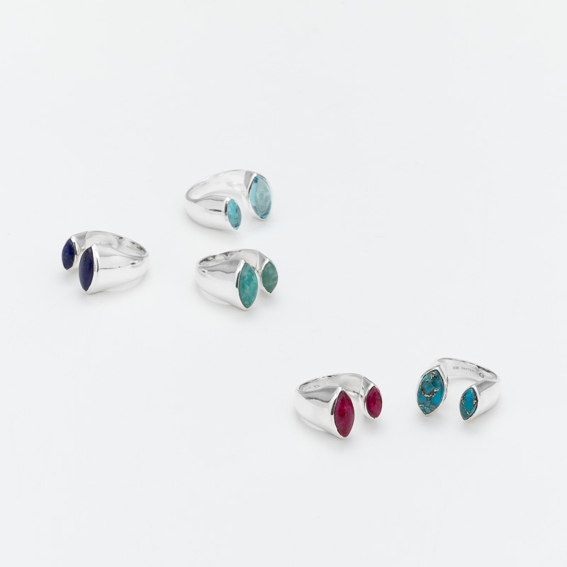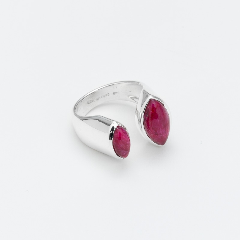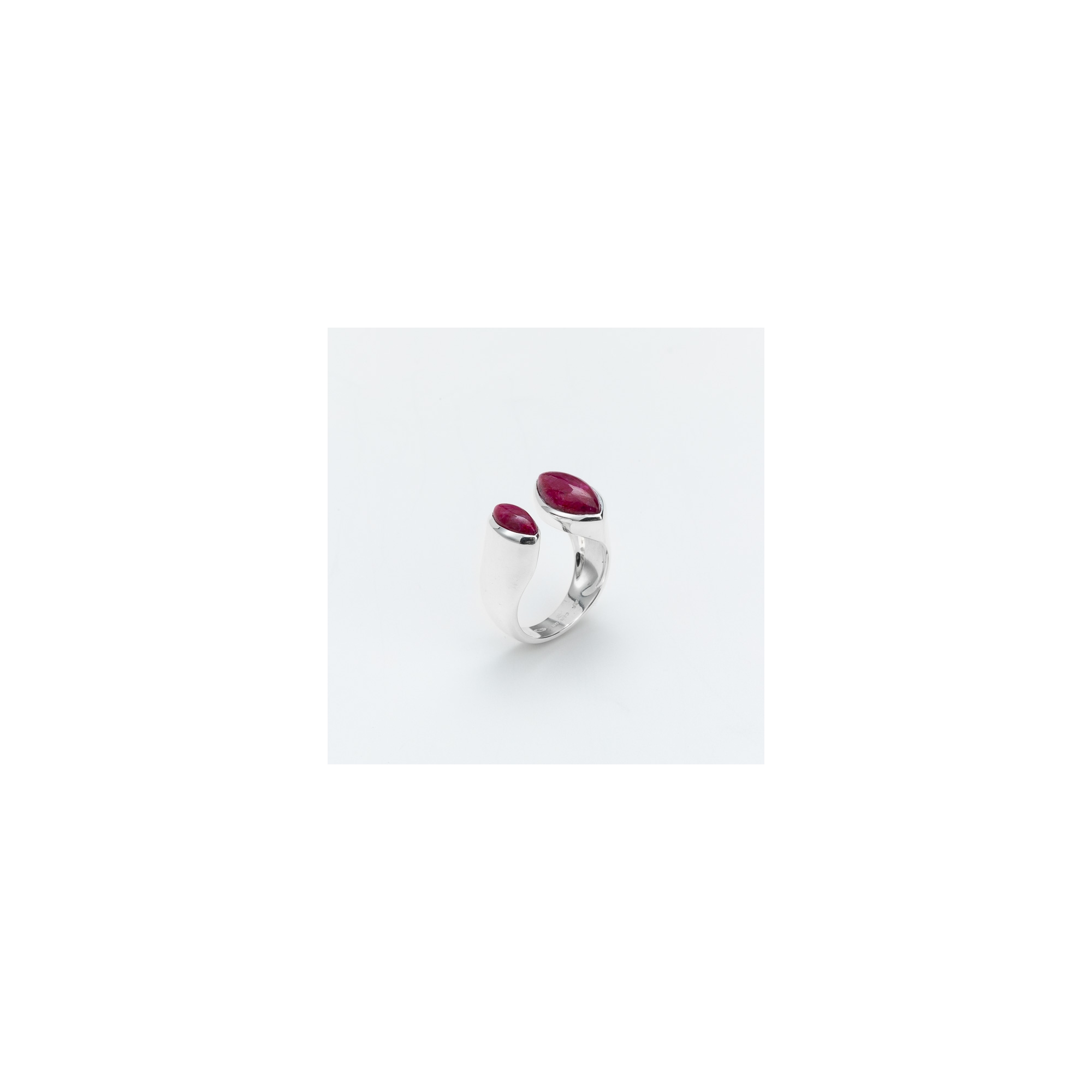 Bague en argent toi et moi composée de 2 rubis indiens en forme de navette et de tailles différentes.