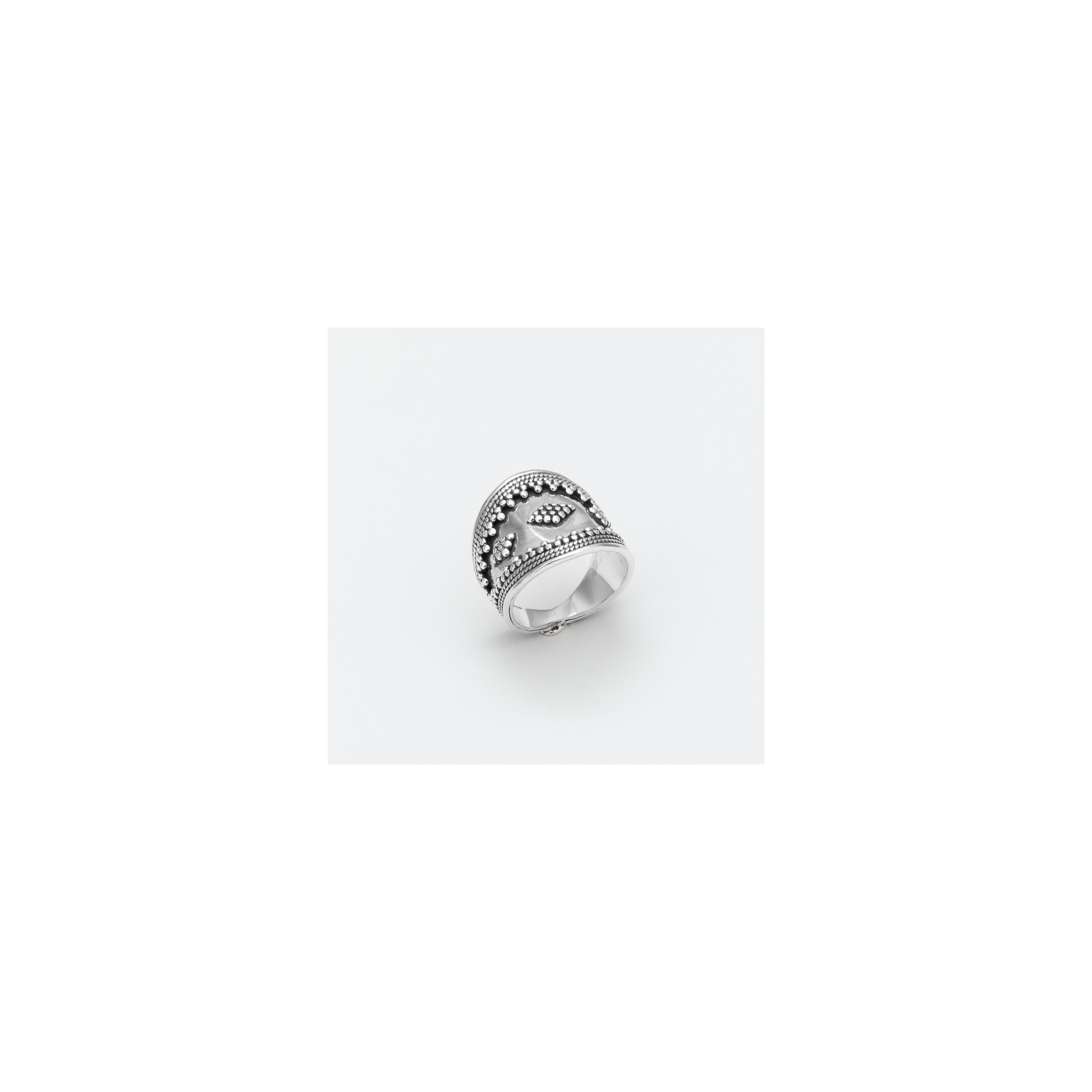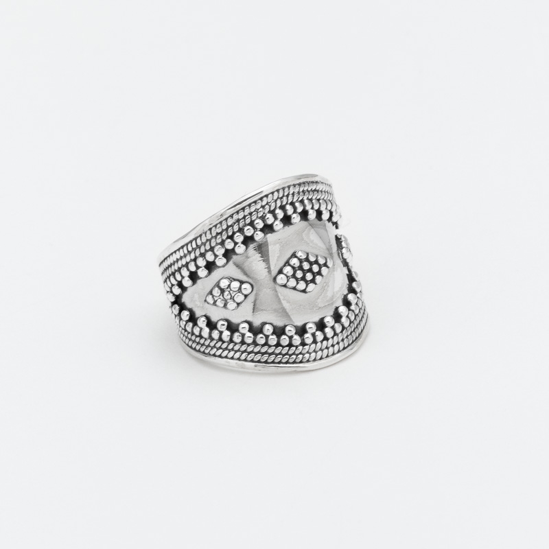 Bague en argent légèrement oxydé vieilli formée par un large anneau lisse décoré par des micro billes en ligne ou en forme de losange