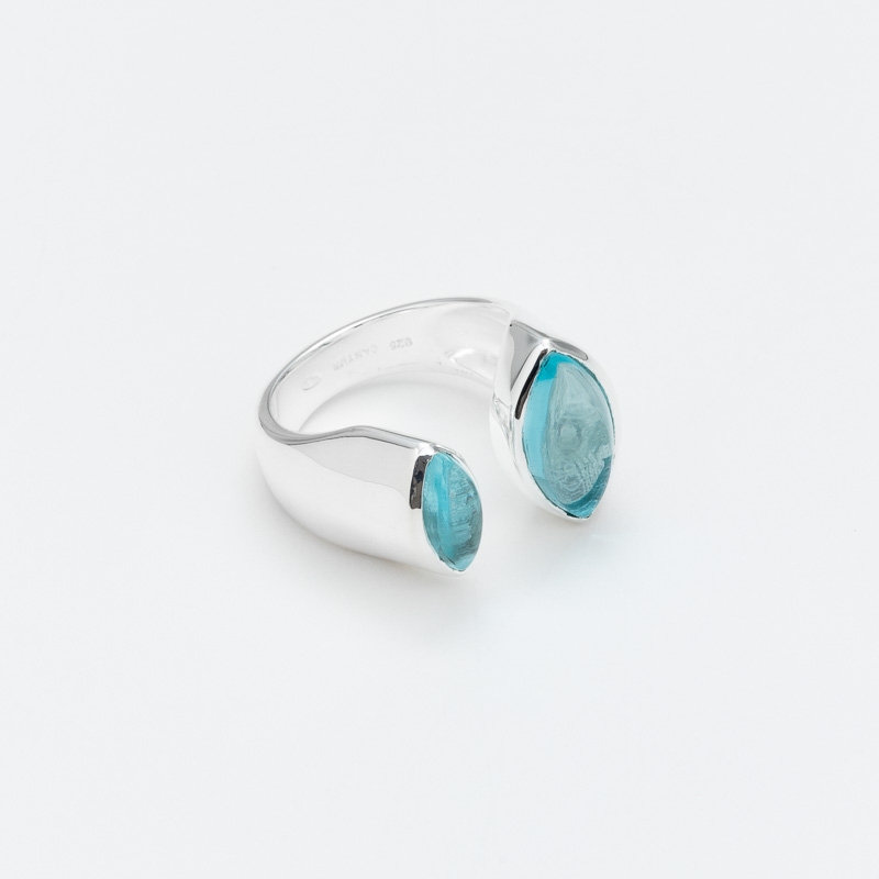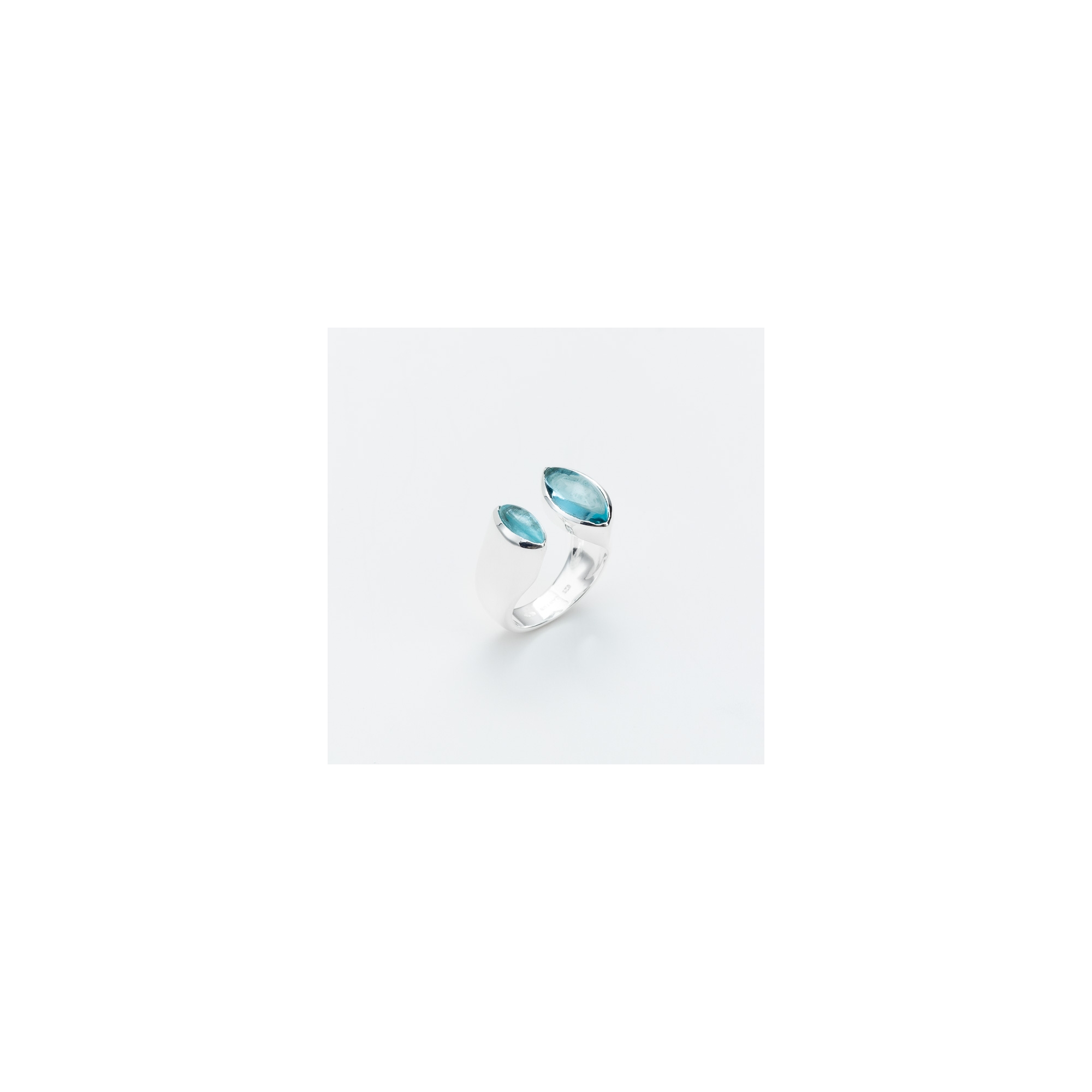 Bague en argent toi et moi composée de 2 topaze bleue synthétique en forme de navette et de tailles différentes