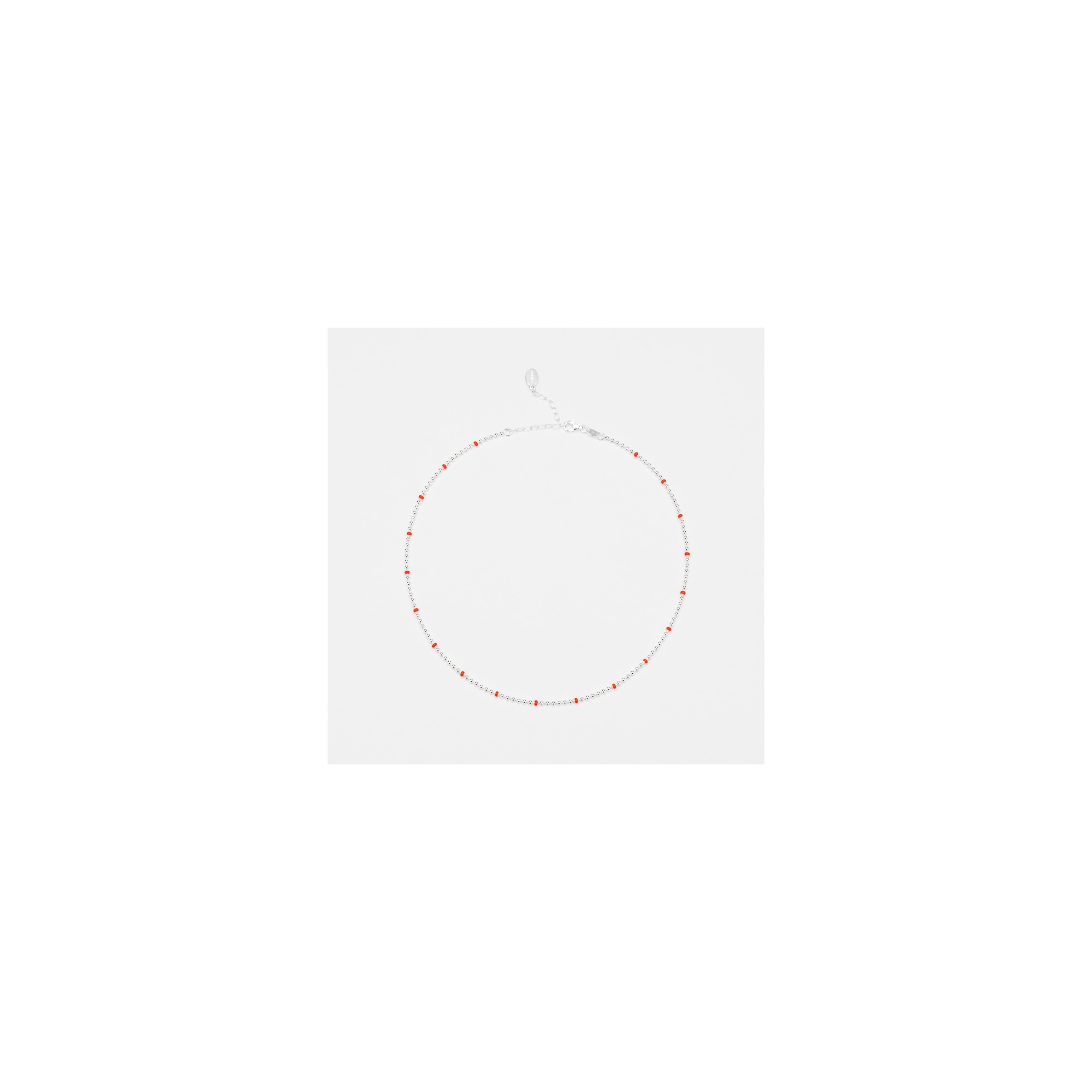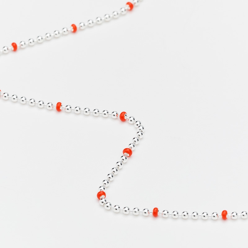 Collier en argent constitué d'une chainette de microboules dont certaines décorée de laque rouge orange.