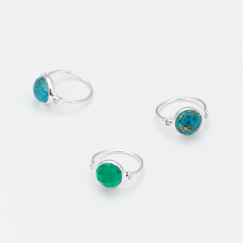 Bague en argent décorée d'une apatite doublet avec de chaque côté 3 mini boules entourant un oxyde blanc