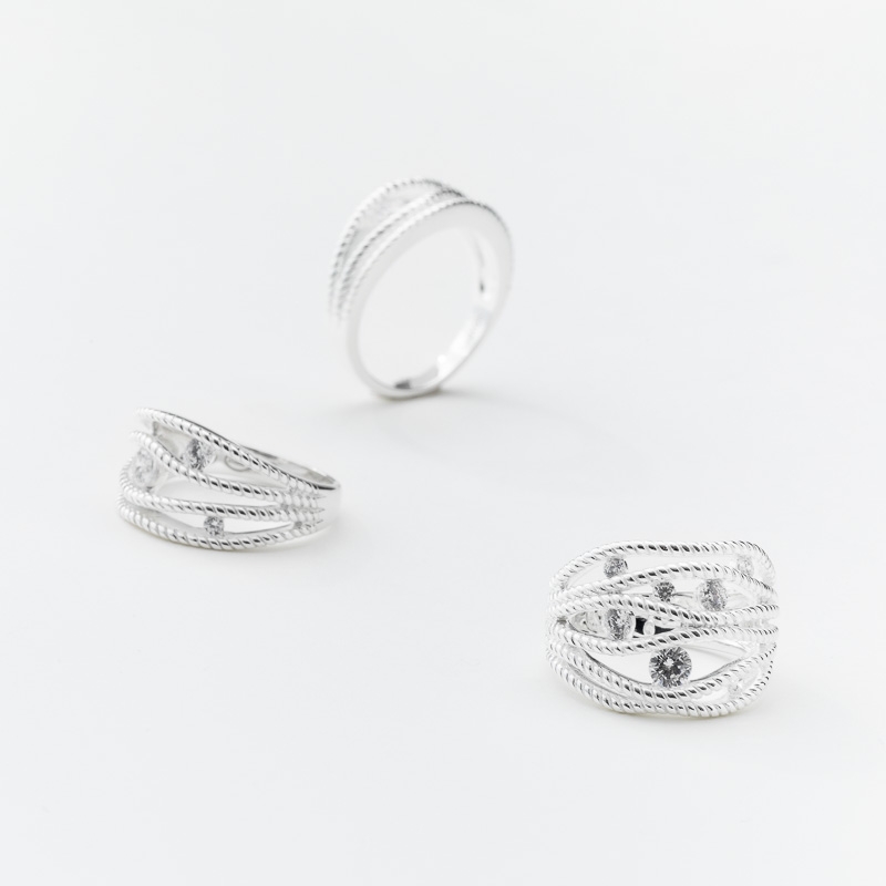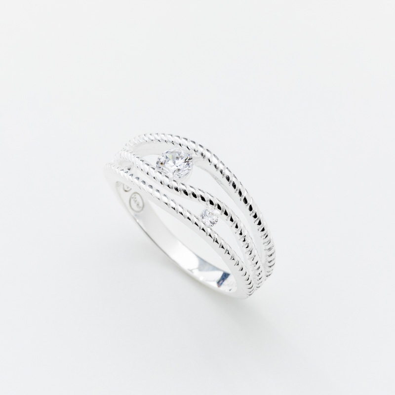 Bague argent formée de 3 anneaux gravés et espacés décorés d'un gros et d'un petit oxyde.