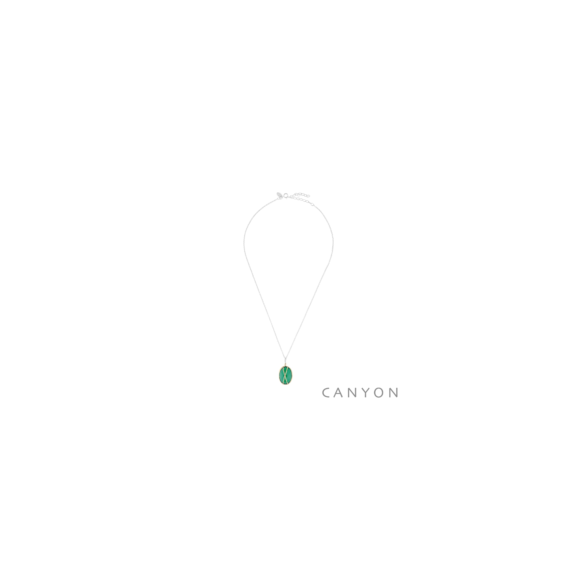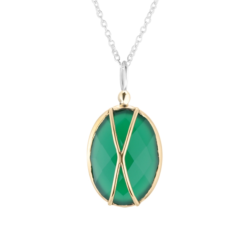 Collier en argent composé d'un ovale d'onyx vert serti de laiton décoré de 2 fils de laiton croisés et d'une chaine fine en argent