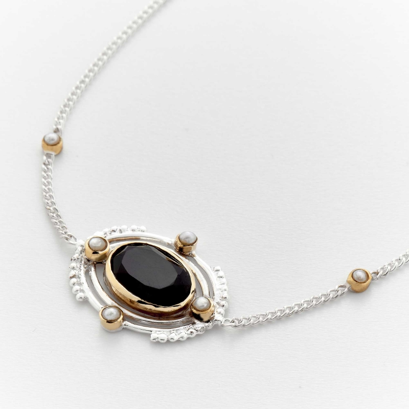 Bracelet en argent et laiton composé d'une chainette en argent décorée de 2 petites perles blanches serties de laiton et en son centre d'un onyx noir ovale et de 4 petites perles blanches serties de laiton.