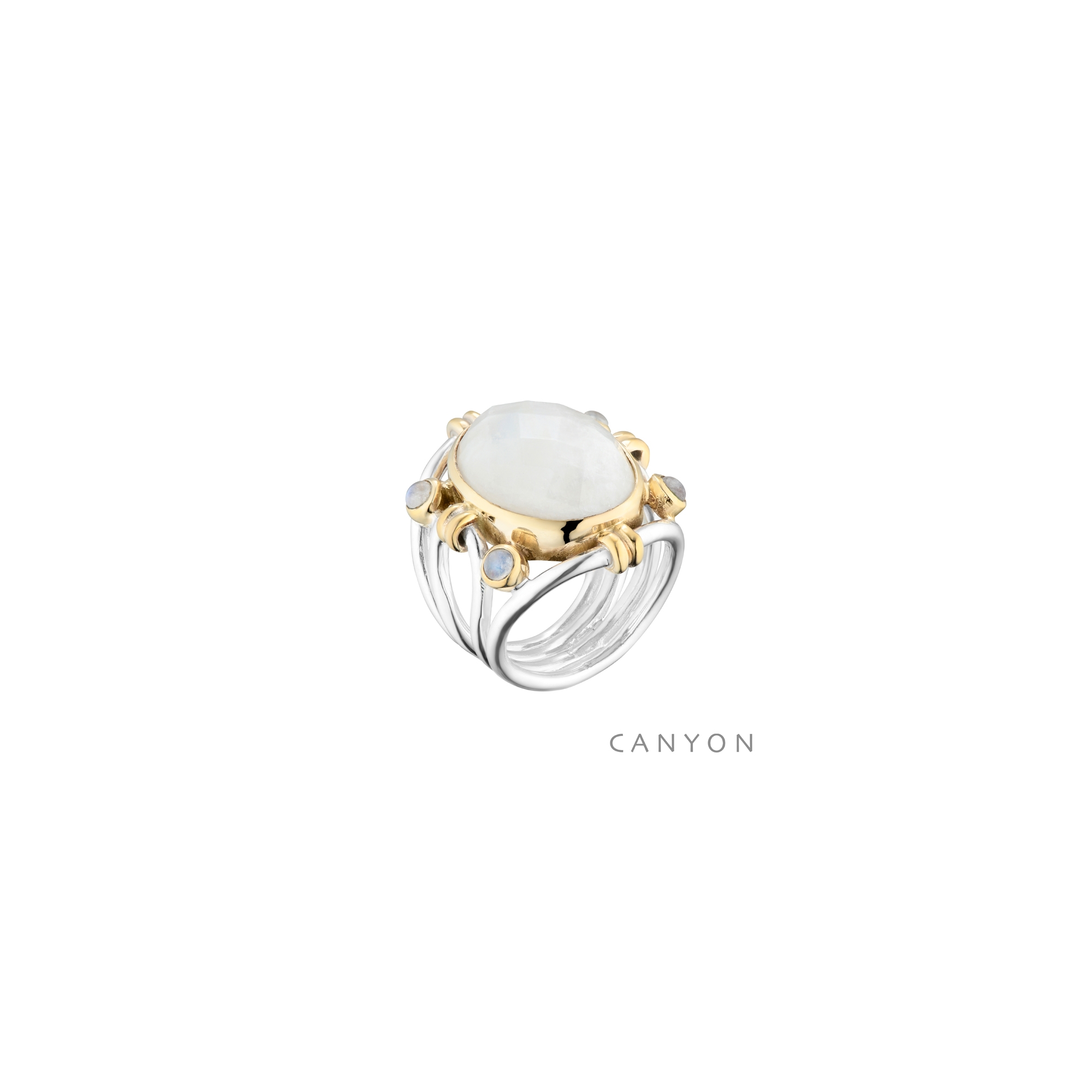 Bague argent et laiton composée d'un anneau argent composé de 4 fils et d'un grand ovale de pierre de lune et de 4 petits tous sertis de laiton .