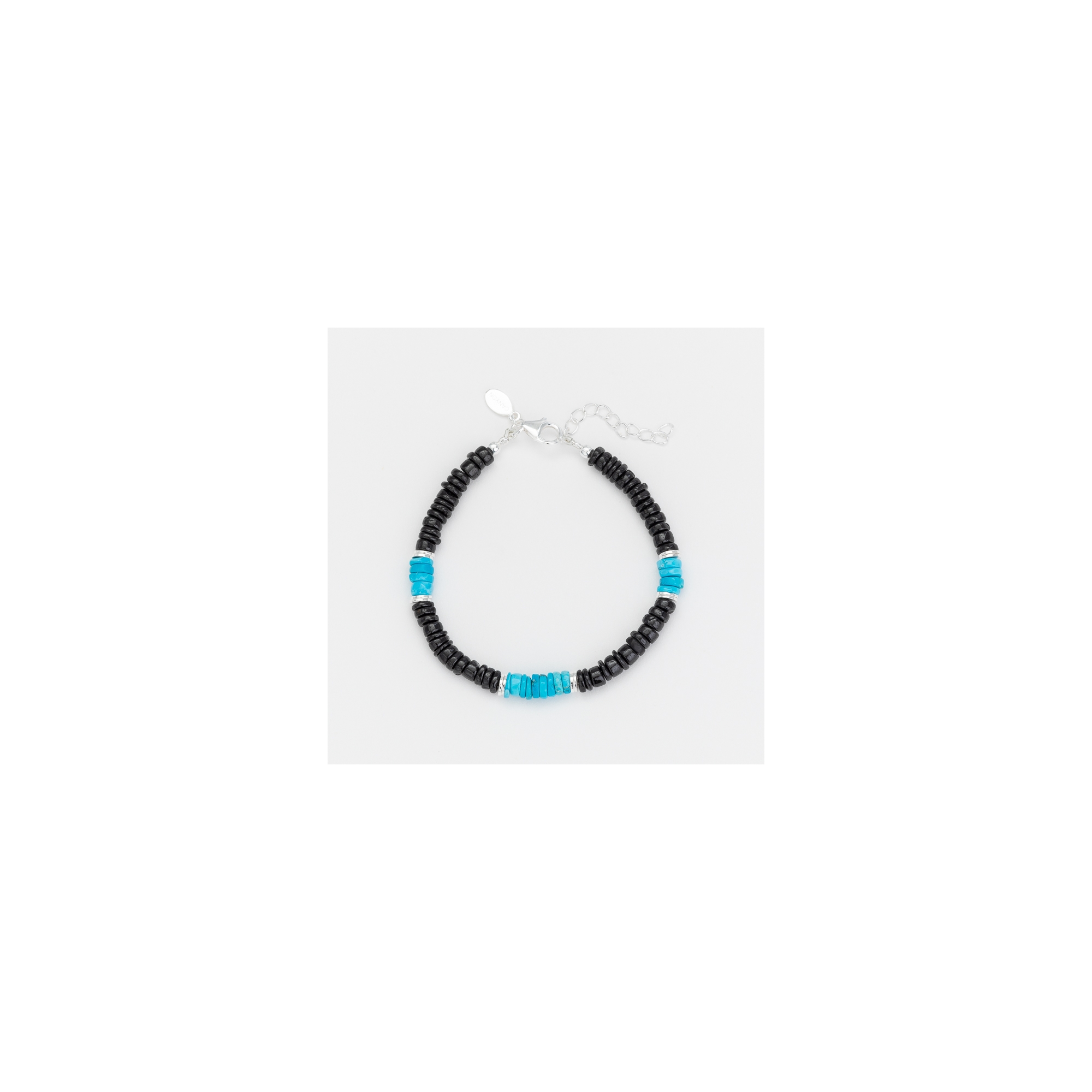 Bracelet en argent pour homme composé de séquences d'onyx noir et de turquoise séparés par de fins anneaux d'argent