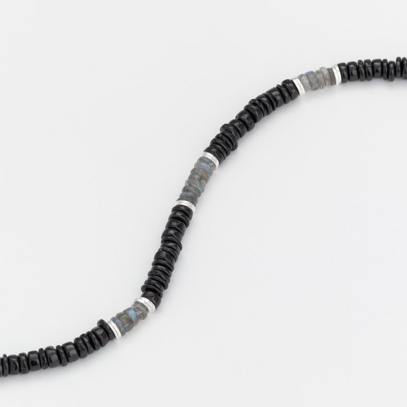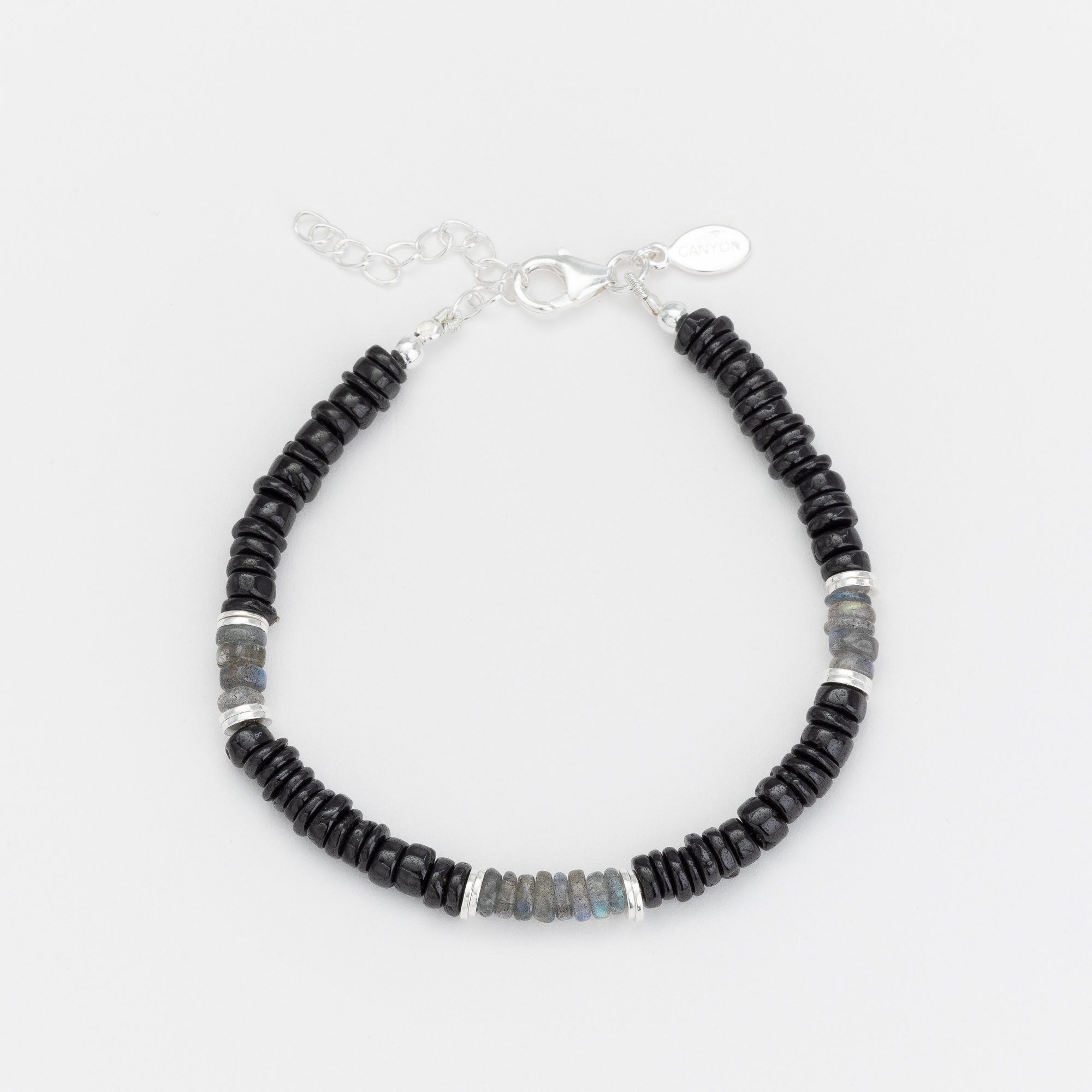 Bracelet en argent pour homme composé de séquences d'onyx noir et de labradorite séparés par de fins anneaux d'argent