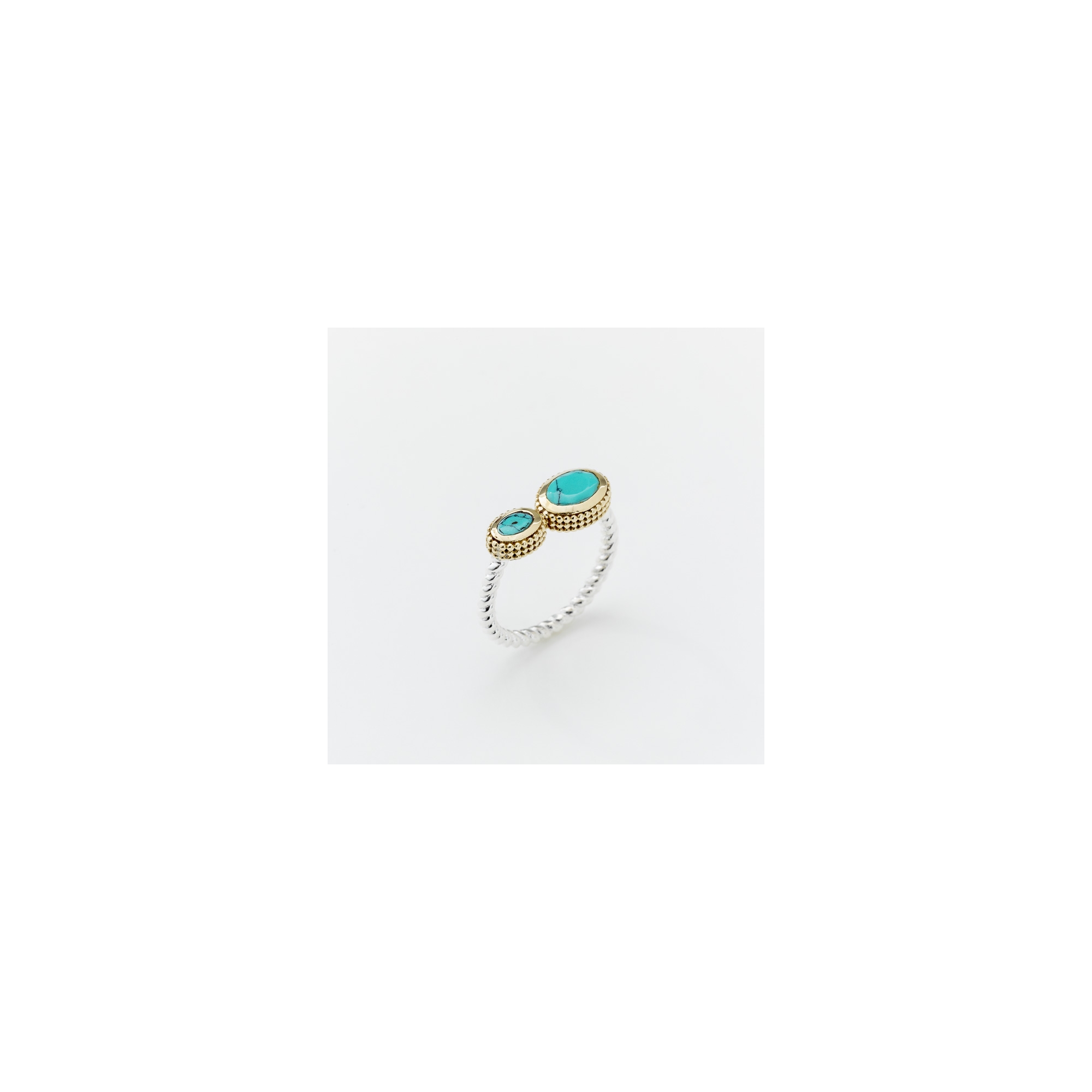 Bague argent et laiton composée d'un anneau argent torsadé et de 2 ovales de turquoise reconstituée bleu avec un sertis en laiton formé de 3 rangs de microboules.