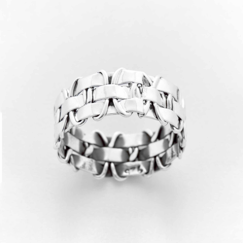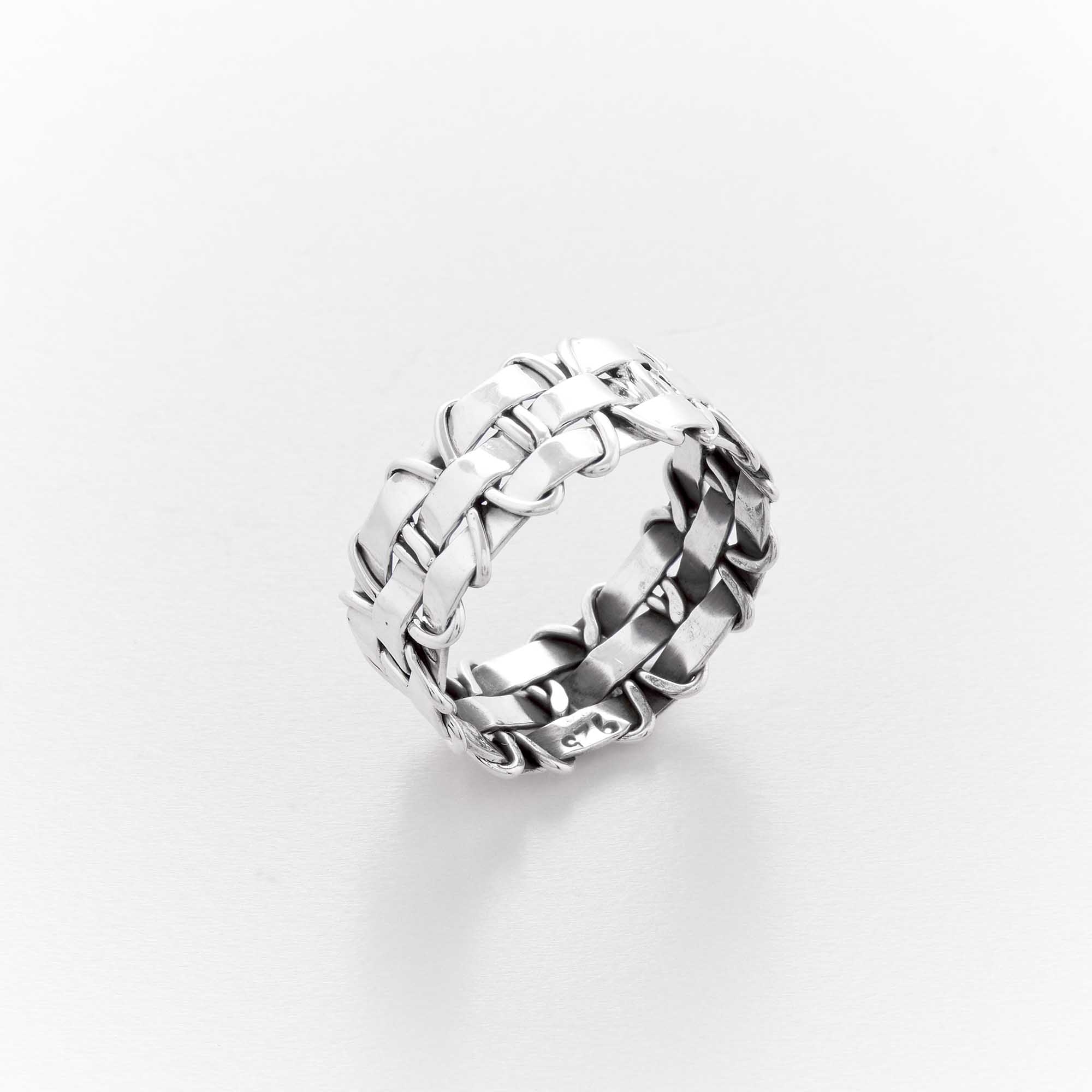 Bague en argent composée de 3 anneaux plats et lisses liés entre eux par un fils fin.